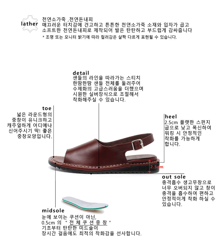 COMMENT 천연소가죽의 소재로 세련되게 발을 잡아주고, 은은한 광택감이 멋스럽게 돌아 여름철 혹은 가을까지 삭스로 코디 해주실 수 있는 샌들을 소개해드립니다. 라운드형의 중창모양이 유니크하고 캐주얼하게 어디에나 신어주실 수 있는 샌들로, 아웃솔 전체로 둘러진 스티치공법이 수제화만의 고급스러움을 더한 제품입니다.
