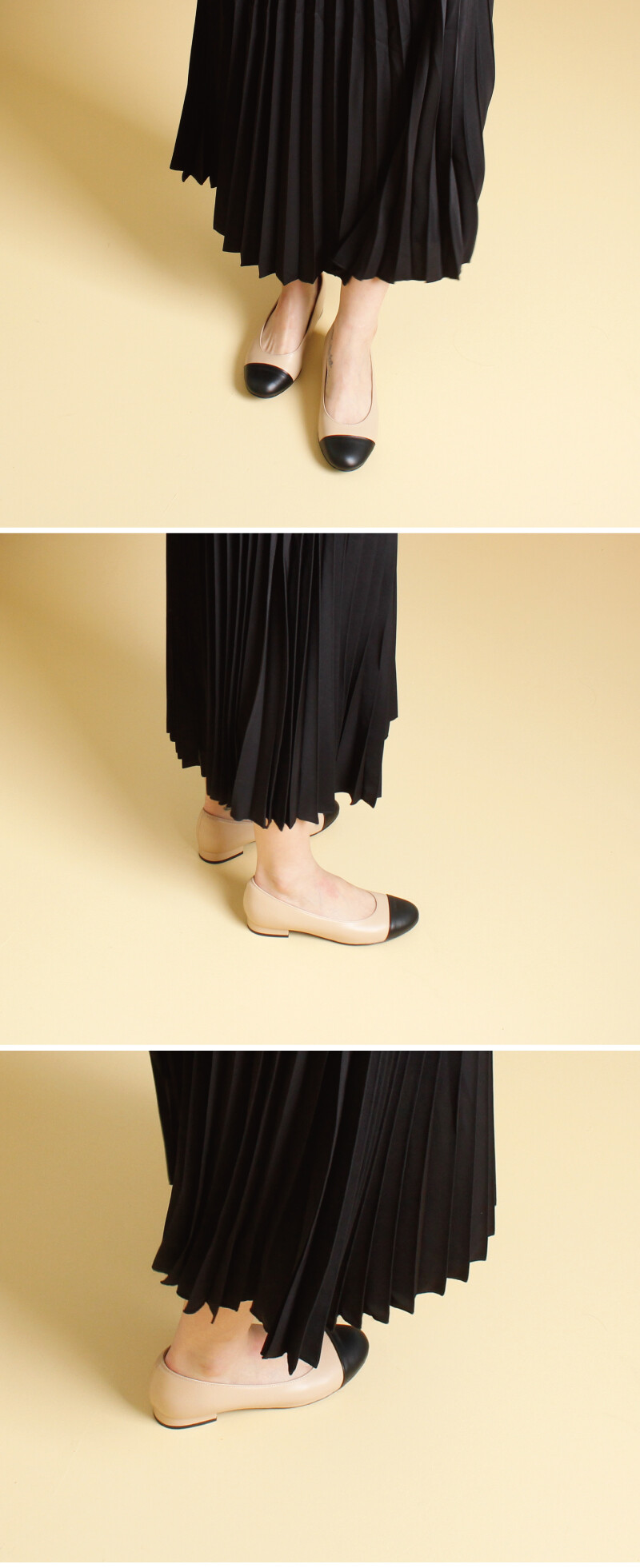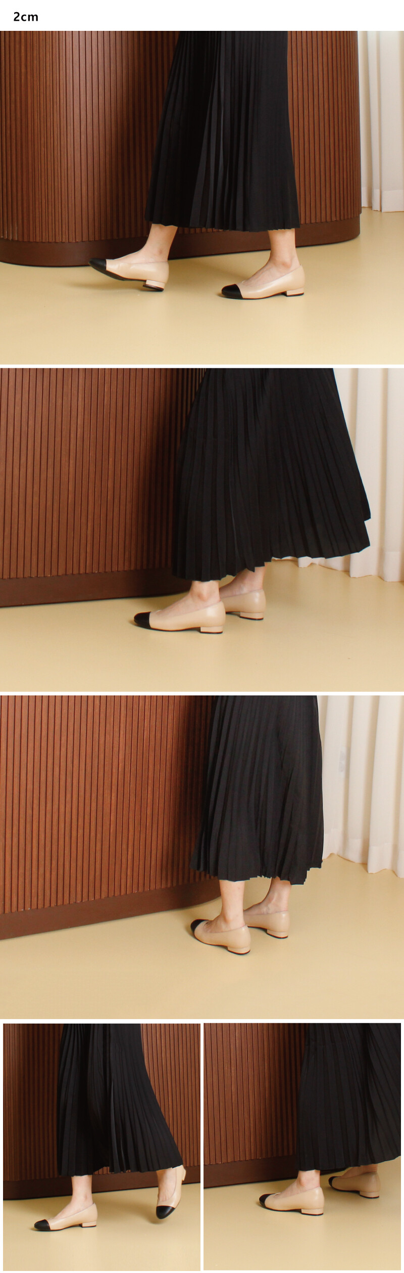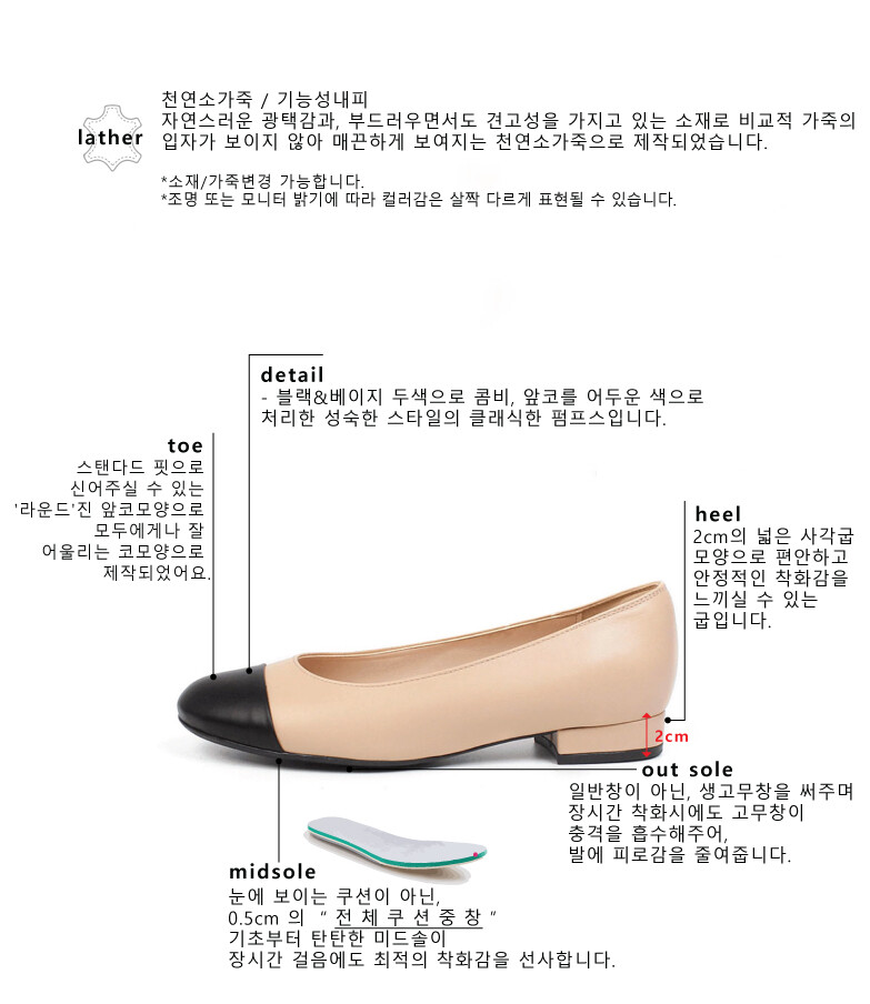 COMMENT 클래식한 디자인으로, 4계절 내내 사랑 받는 라운드 코모양의 플랫을 소개해드려요! ◡̈ღ 자연스러운 광택감과, 부드러우면서도 견고성을 가지고 있는 소재로 비교적 가죽의 입자가 보이지 않아 매끈하게 보여지는 천연소가죽으로 제작되었습니다. 스탠다드 핏으로 신어주실 수 있는 '라운드'진 앞코모양으로 모두에게나 잘 어울리는 코모양으로 제작되었어요. 블랙&베이지 두색으로 콤비, 앞코를 어두운 색으로 처리한 성숙한 스타일의 클래식한 펌프스입니다. 2cm 넓은 사각굽모양으로 편안하고 안정적인 착화감을 느끼실 수 있습니다. 일반창을 연질처리한 아웃솔로, 쉽게 닳지 않고 미끄럼방지에 뛰어납니다.