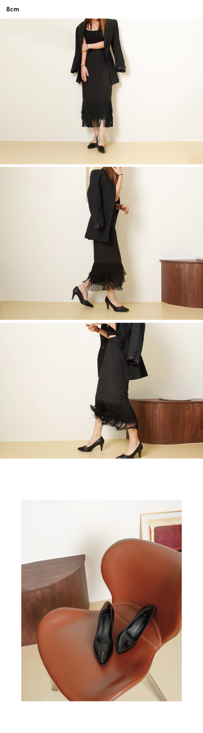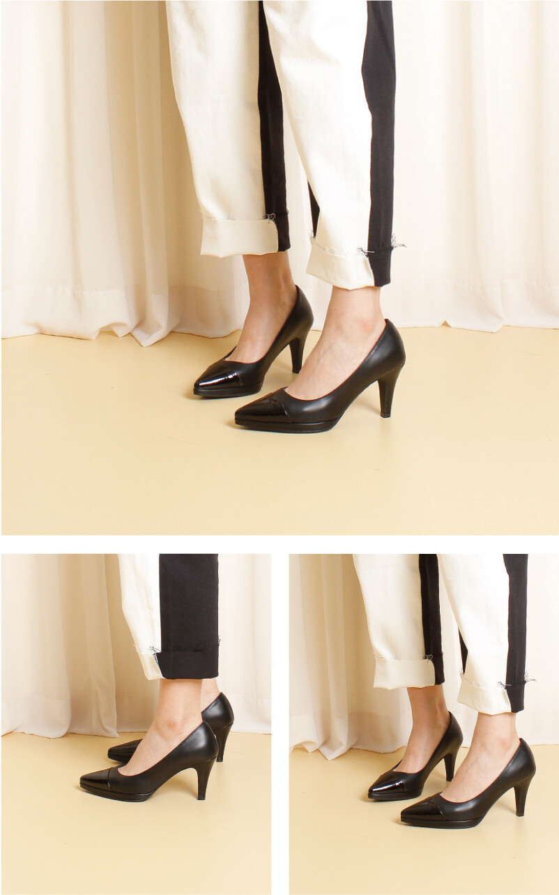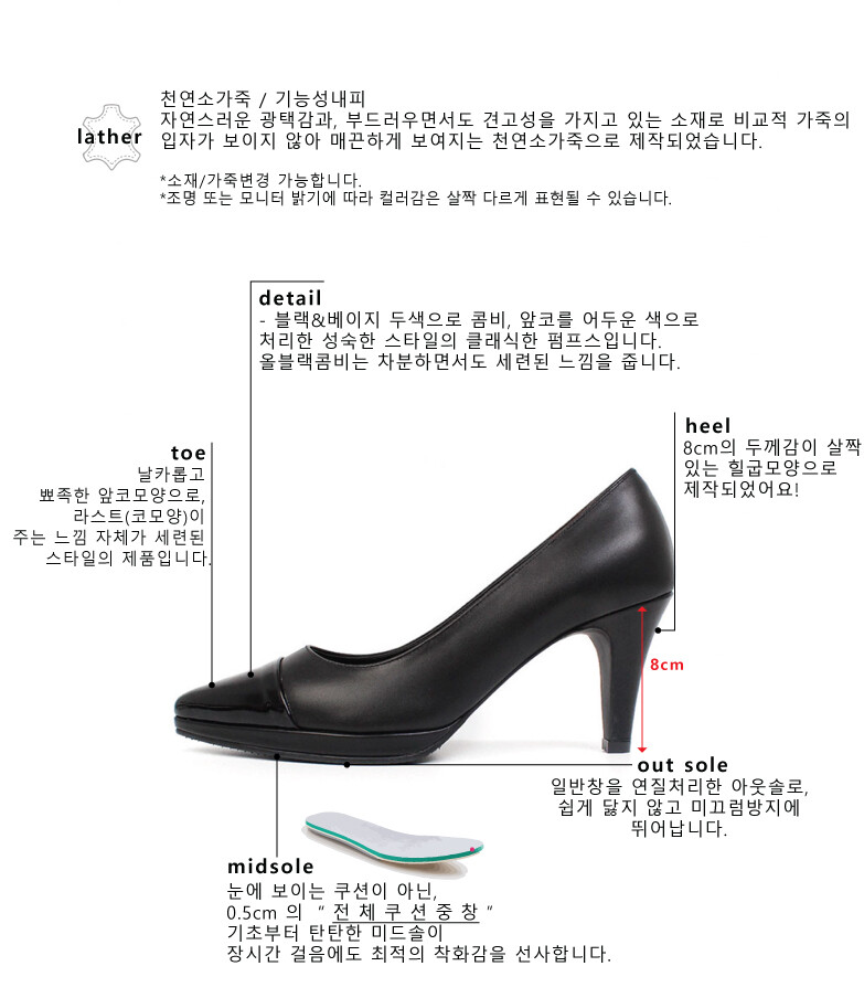 COMMENT 클래식한 디자인으로, 4계절 내내 사랑 받는 포인티드 펌프스를 소개해드려요! ◡̈ღ 8cm높이에 1센티가보시를 넣어 보다 편하게! 자연스러운 광택감과, 부드러우면서도 견고성을 가지고 있는 소재로 비교적 가죽의 입자가 보이지 않아 매끈하게 보여지는 천연소가죽으로 제작되었습니다. 날카롭고 뾰족한 앞코모양으로, 라스트(코모양)이 주는 느낌 자체가 세련된 스타일의 제품입니다. 블랙&베이지 두색으로 콤비, 앞코를 어두운 색으로 처리한 성숙한 스타일의 클래식한 펌프스입니다. 올블랙콤비는 차분하면서도 세련된 느낌을 줍니다. 1cm의 겉가보시를 써주어 무게감이 크게 느껴지지 않으면서도 편하게 즐겨주실 수 있습니다. 8cm의 두께감이 살짝 있는 힐굽모양으로 제작되었어요! 일반창을 연질처리한 아웃솔로, 쉽게 닳지 않고 미끄럼방지에 뛰어납니다.