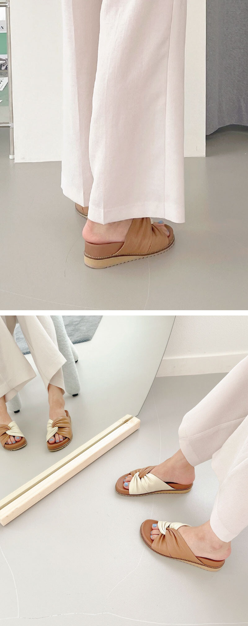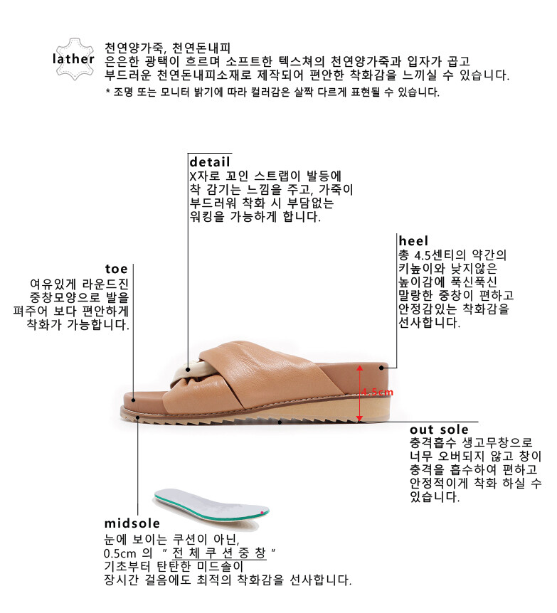 COMMENT 부드러운 천연양가죽과 돈내피로 제작된 샌들로, 꼬임디테일이 여성스러운 느낌을 주는 제품입니다. 발을 양쪽으로 감싸주어 슬리퍼지만 워킹시에도 발목에 무리없이 착화가 가능한 제품입니다. 말랑한 중창과 착화감이 좋은 고무창으로, 4.5센치의 낮지않은 높이감이지만 장시간 착화 시 고무창이 충격을 흡수해줍니다.