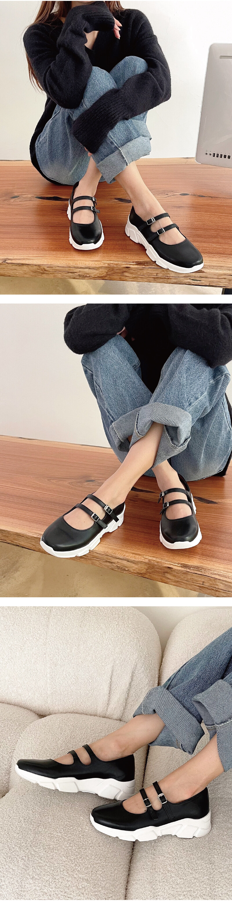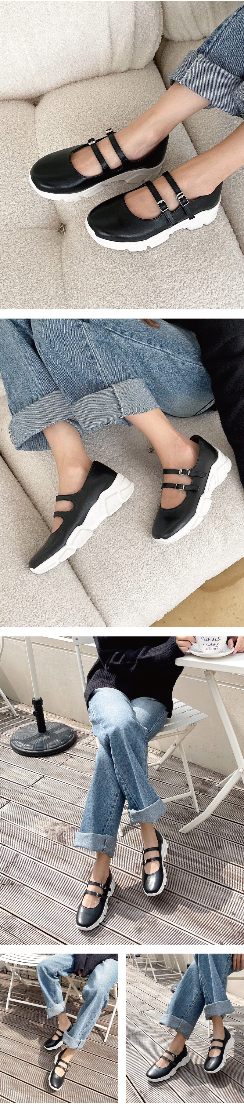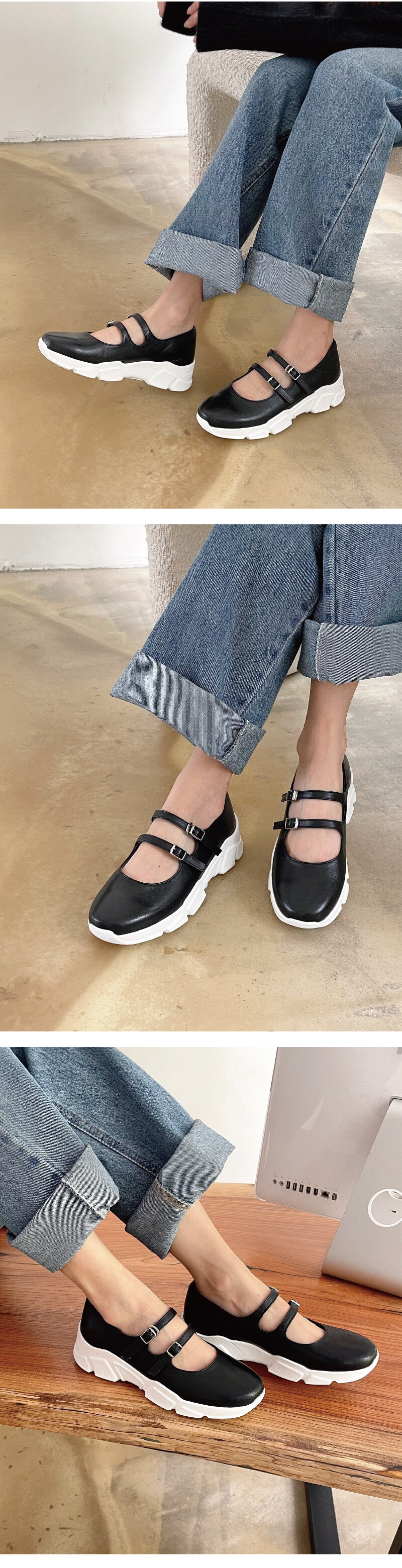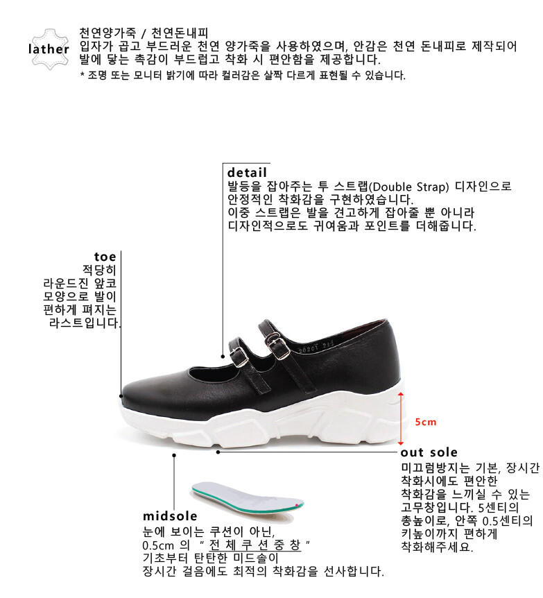 COMMENT 두개의 스트랩이 발등으로 들어간 메리제인 스니커즈를 소개해드립니다 : ) 입자가 곱고 부드러운 천연 양가죽을 사용하였으며, 안감은 천연 돈내피로 제작되어 발에 닿는 촉감이 부드럽고 착화 시 편안함을 제공합니다. 적당히 라운드진 앞코 라인으로 발가락이 자연스럽게 펴지는 편안한 구조를 자랑합니다. 일반적인 플랫슈즈의 실루엣을 기본으로 하지만, 스니커즈에서 주로 사용되는 아웃솔을 적용하여 독창적이고 세련된 분위기를 연출합니다. 발등을 잡아주는 투 스트랩(Double Strap) 디자인으로 안정적인 착화감을 구현하였습니다. 이중 스트랩은 발을 견고하게 잡아줄 뿐 아니라 디자인적으로도 귀여움과 포인트를 더해줍니다. 충격 흡수가 우수한 생고무창을 사용하여 장시간 착용 시에도 편안함을 유지할 수 있습니다. 미끄럼 방지 기능이 적용되어 안전한 보행을 돕습니다. 겉굽 높이는 5cm, 안쪽에는 약 0.5cm의 키높이가 더해져 편안한 착화와 자연스러운 키 높이 효과를 동시에 제공합니다.