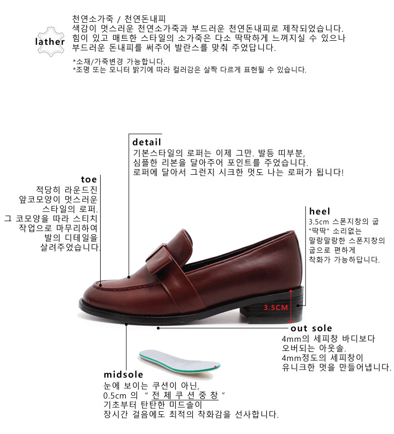 COMMENT 어디에나 편하게 신어줄 수 있는 로퍼~리본을 똑 달아본 디자인을 소개해드립니다! 힘이 있고 매트한 스타일의 소가죽은 다소 딱딱하게 느껴지실 수 있으나 부드러운 돈내피를 써주어 발란스를 맞춰 주었답니다. *부드러운 가죽을 원하시는 분들은 소재변경도 가능합니다. 적당히 라운드진 앞코모양이 멋스러운 스타일의 로퍼. 너무 둥글지 않아 드레시한 느낌도 살짝~ 그 코모양을 따라 스티치 작업으로 마무리하여 발의 디테일을 살려주었습니다. 기본스타일의 로퍼는 이제 그만. 발등 띠부분, 심플한 리본을 달아주어 포인트를 주었습니다. 로퍼에 달아서 그런지 시크한 멋도 나는 로퍼가 됩니다! 3.5cm 스폰지창의 굽 "딱딱" 소리없는 말랑말랑한 스폰지창의 굽으로 편하게 착화가 가능하답니다. 4mm의 세피창 바디보다 오버되는 아웃솔. 4mm정도의 세피창이 유니크한 멋을 만들어냅니다.