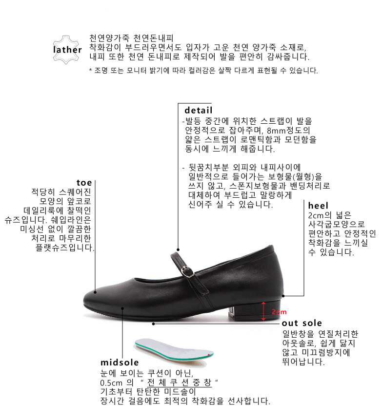 COMMENT 로맨틱함과 모던함을 동시에 느낄 수 있는 부드러운 플랫슈즈 입니다. 외피의 소재는 입자가 곱고 부드러운 소재로 천연돈내피로 쓰여진 내피와 만나 착화 느낌을 한층 더 업 시켰습니다. 버클 걸이 없이 발등 중간에 위치한 스트랩으로 신고 벗기 편하며 8mm정도의 적당한 두께감의 스트랩이 발을 잘 잡아줍니다. 많은 사랑을 받았던 디자인인만큼, 이번 봄시즌에는 고운 컬러들로 제작해보았습니다. 아이보리/버터/핑크/연밤 4가지 컬러가 추가되었으며, 변경된 부분은 <아웃솔(바닥)·내피> 색상을 베이지 컬러로 제작해 화사한느낌을 주었습니다. 굽높이는 2cm의 넓은 사각굽모양으로 편안하고 안정적인 착화감을 느끼실 수 있습니다.