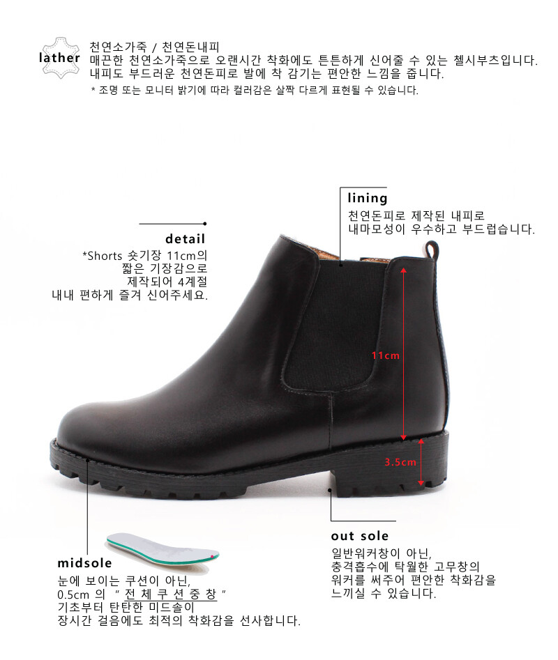 사이드 밴드를 적용하여 디자인한 첼시부츠! 매년사랑 받는 아이템으로 베티아노만의 강점인 #생고무창 으로 편안한 착화감을 느끼실 수 있는 워커창으로 제작되었어요. 짧은 숏기장의 11cm로 제작되어 삼계절 내내 편하게 즐겨 신으실 수 있는 디자인 입니다. 사이드 지퍼디테일로 오픈/클로징 할 수 있어 편하답니다. 소가죽의 매끈한 질감역시 멋스럽게 표현된 제품입니다. 내피역시 천연돈내피로 제작되었으며 고급스러운 느낌을 살려 소털색의 컬러로 마무리한 첼시부츠. 베티아노에서 편하게 즐겨신어보세요!