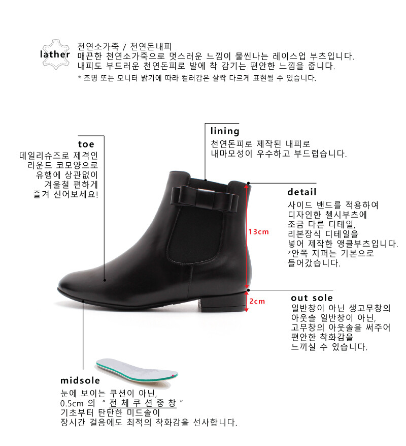 사이드 밴드를 적용하여 디자인한 첼시부츠에 조금 다른 디테일을 넣어본 #리본첼시부츠 입니다. 그전 첼시부츠와는 달리 앞코부분을 슬림한 코모양으로 빼주어 여성스러운 느낌을 한 껏 살려준 디자인이랍니다. 2cm 안정되고 플랫한 높이감으로 편하게 즐겨신어보세요. 베티아노의 생고무창으로 아웃솔로 착화감 역시 놓치지 않았구요, 사이드 지퍼디테일로 오픈/클로징 할 수 있어 편하답니다. 소가죽의 매끈한 질감역시 멋스럽게 표현된 제품입니다. 색다른 느낌의 여성스러운 첼시부츠를 원하시는 분들에게 강추해드리는 제품입니다.