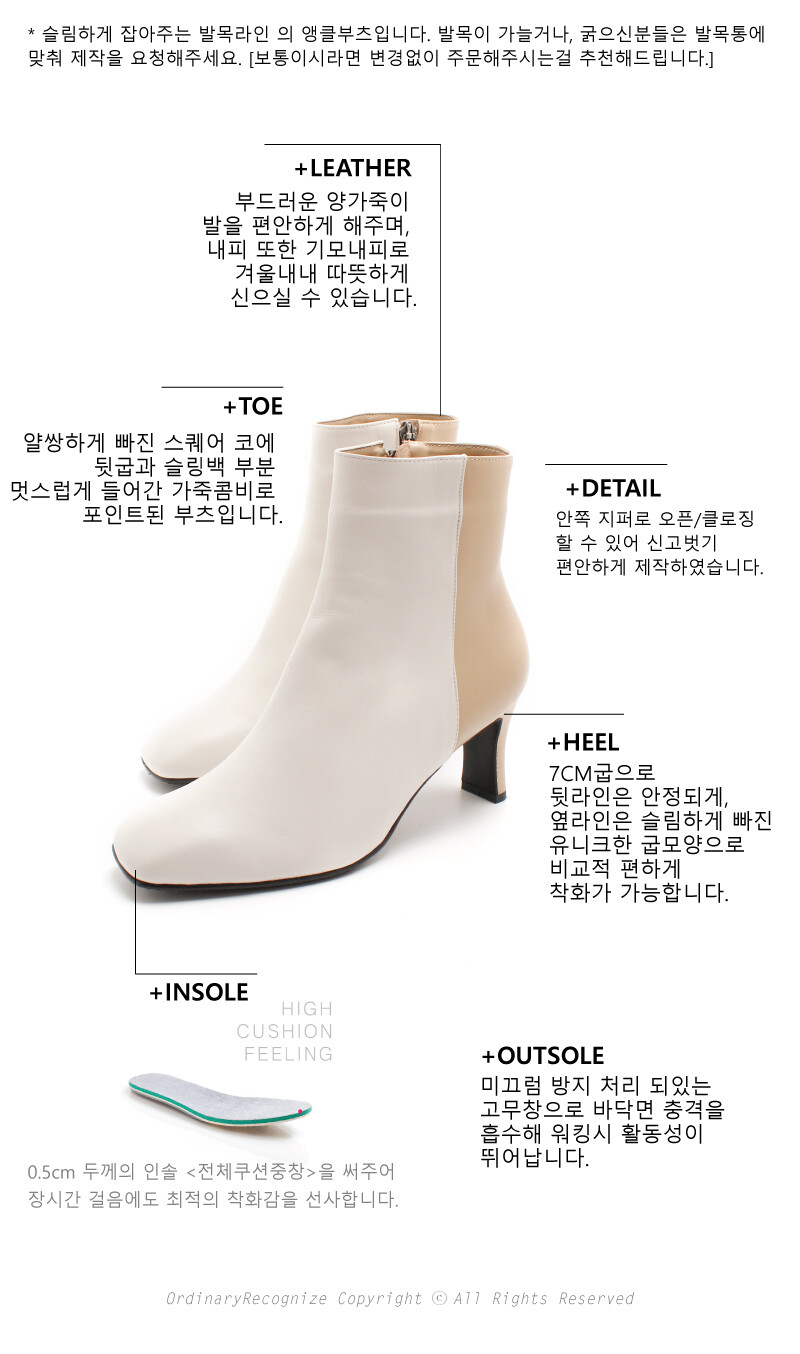 개인적으로 가장 자주 신게 되는 색은 블랙과 그레이, 그리고 올 크림색과 베이지! 그래서 이런색들로 디자인해본 콤비 앵클부츠랍니다. 이런 컬러들이 만났을 때 되게 적당히 멋스러운 느낌이 들 수 있다고 생각합니다. 베이직 한 디자인에 컬러콤비 하나로 멋스러움을 담은 디자인입니다. 양가죽소재와 폭신한 기모내피소재로 7센티의 높이지만 편안히 즐길 수 있는 높이로 느껴지실 거에요. 안쪽 지퍼로 오픈/클로징 할 수 있어 신고 벗기 편하게 제작되었으며, 발목치수는 비교적 핏트되게 나온 디자인으로 발목이 가늘거나, 굵으신분들은 발목통에 맞춰 제작을 요청해주세요. [보통이시라면 변경없이 주문해주시는걸 추천해드립니다.]