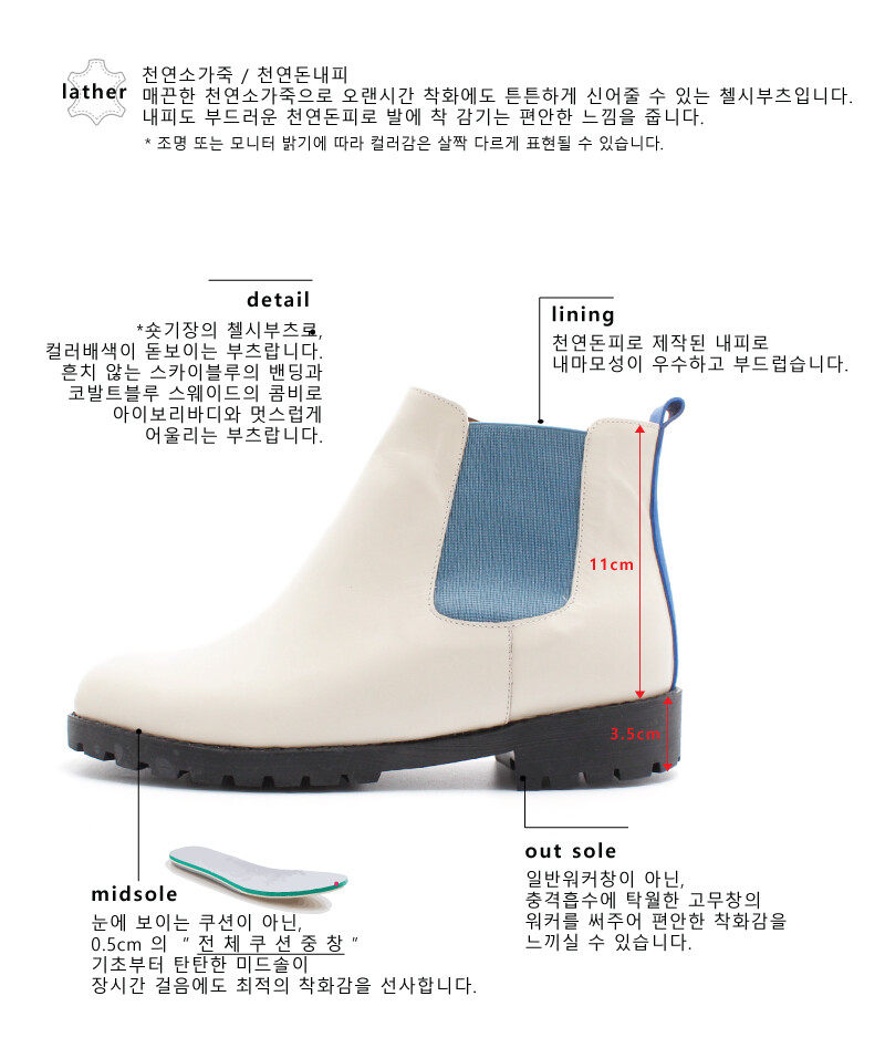사이드 밴드를 적용하여 디자인한 첼시부츠! 매년사랑 받는 아이템으로 베티아노만의 강점인 #생고무창 으로 편안한 착화감을 느끼실 수 있는 워커창으로 제작되었어요. *숏기장의 첼시부츠로, 컬러배색이 돋보이는 부츠랍니다. 흔치 않는 스카이블루의 밴딩과 코발트블루 스웨이드의 콤비로 아이보리바디와 멋스럽게 어울리는 부츠랍니다. 사이드 지퍼디테일로 오픈/클로징 할 수 있어 편하답니다. 소가죽의 매끈한 질감역시 멋스럽게 표현된 제품입니다. 내피역시 천연돈내피로 제작되었으며 고급스러운 느낌을 살려 소털색의 컬러로 마무리 했습니다.