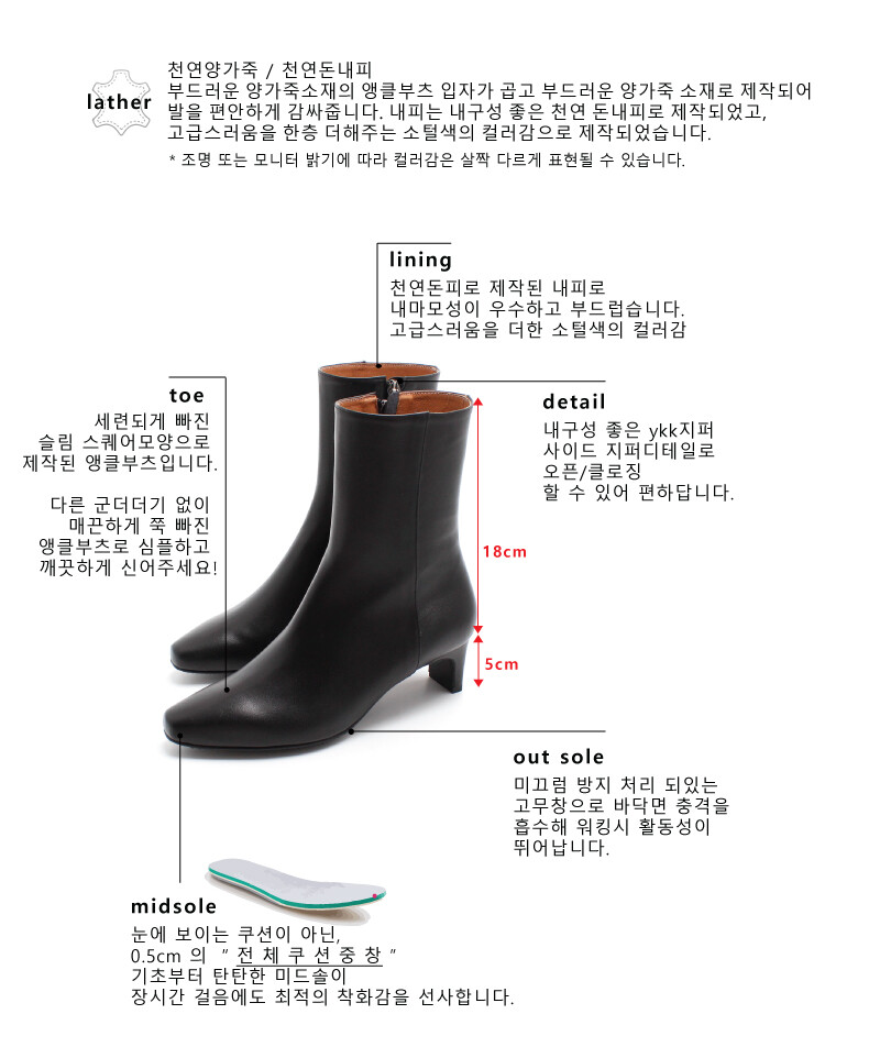 슬림하게 빠진 스퀘어 코모양에 군더더기 없이 매끈하게 쭉 빠진 양가죽 앵클부츠를 소개해드립니다. 총기장 18cm의 기장감 있는 부츠 굽제외 18cm 로 제작된 부츠로, 하프기장과 앵클부츠 사이의 기장으로 세련된 멋을 주는 기장이라고 생각하시면 됩니다! 한겨울 롱스커트나, 미니스커트 기장에도 다리가 가장 얇아보이는 기장으로 강추! 해드립니다 : ) 5cm의 슬림한 하면서 안정된 느낌의 굽모양으로 편안한 워킹을 즐기실 수 있습니다.