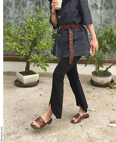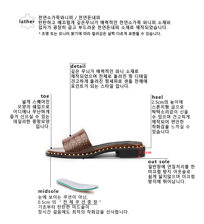 COMMENT 기본스타일의 슬리퍼 디자인에 고급스러운 스터디 디테일이 더해진 샌들입니다. 스퀘어진 중창 모양으로 멋스럽게 어디에나 툭~ 신어주기 좋은 디자인의 슬리퍼입니다. 소재 자체가 주는 느낌도 놓치지 않은 디자인으로, 소가죽의 깊은 무늬가 매력적인 소가죽 와니피의 특피로 제작되었습니다. 2.5cm의 일반굽보단 비교적말랑한 스폰지줄굽으로 제작되어 굽에서 나는 딱딱 소리없이 신어주실 수 있습니다. 자체 적으로 개발한 스터드 세피창으로 어디에도 없는 유니크한 디자인의 슬리퍼! 한여름 유니크한 슬리퍼를 찾으신다면 강추해드릴게요!
