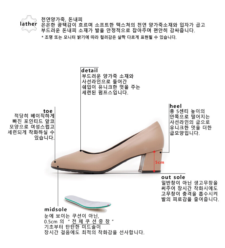 COMMENT 부드러운 양가죽과 돈내피로 제작된 기본 펌프스입니다. 5센티의 사선굽모양으로 제작되어 두께감이 어느정도 있으며 안정되게 착화해주실 수 있는 제품입니다. 생고무창의 아웃솔은 충격을 흡수해주며 장시간 착화시에도 편안히 신어주실 수 있는 제품입니다.