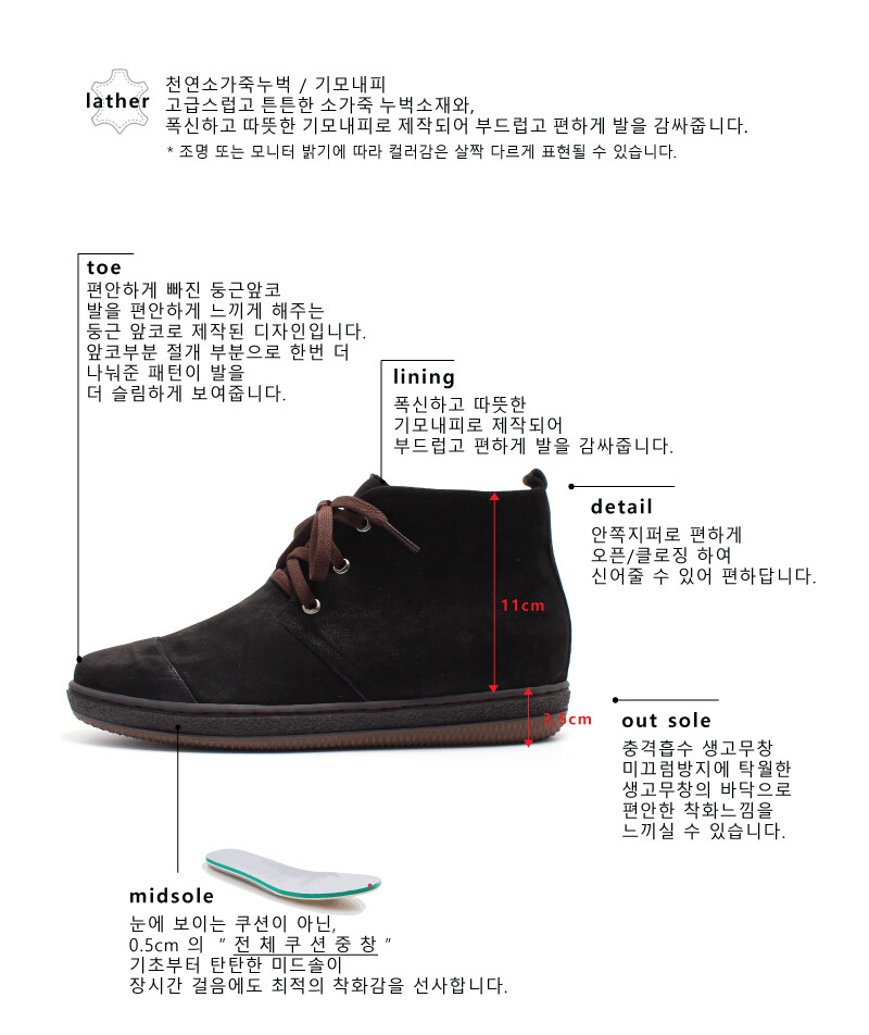 COMMENT 발목으로 살짝 올라오는 스니커즈 스타일의 기모 앵클부츠랍니다! 짧은 기장감으로 가을부터 즐겨신으실 수 있으며, 튼튼하고 견고한 소가죽 누벅소재로 제작되었습니다. 포근하고 따뜻한 기모내피로 제작되어 부드럽게 발을 감싸줍니다. 편안하게 빠진 둥근앞코 발을 편안하게 느끼게 해주는 둥근 앞코로 제작된 디자인입니다. 앞코부분 절개 부분으로 한번 더 나눠준 패턴이 발을 더 슬림하게 보여줍니다.