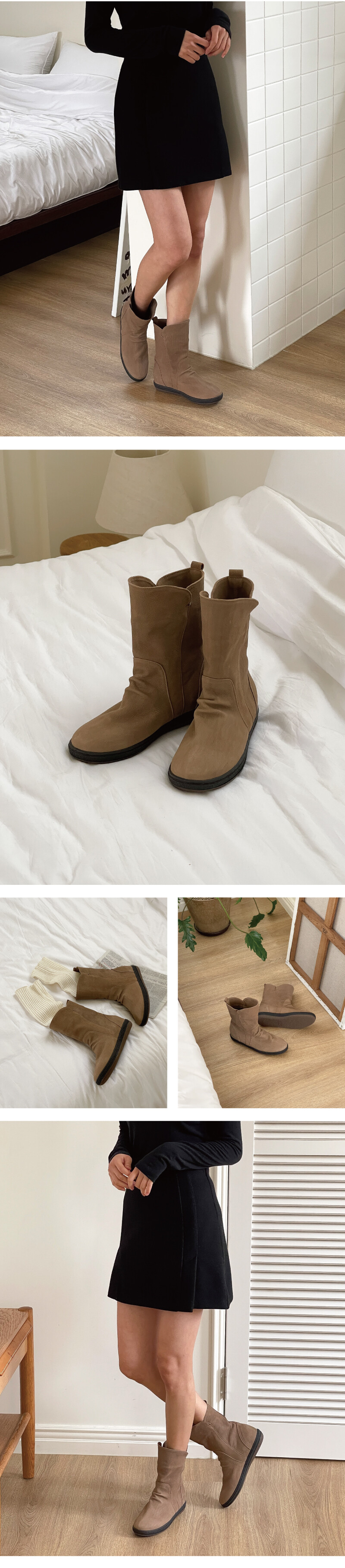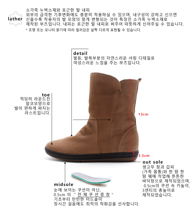 COMMENT 발등, 발목부분의 자연스러운 셔링 디테일로 여성스러운 느낌을 주는 부츠로, 외부의 급격한 기후변화에도 충분히 착용하실 수 있으며, 내구성이 강하고 신으면 신을수록 착용자의 발 모양의 맞게 변형되는 것이 특징인 소가죽 누벅소재로 제작된 부츠입니다. 내피는 포근한 털 내피로 써주어 따뜻하게 신어주실 수 있습니다. 부츠 총기장(굽 제외) 18.5cm의 기장감으로 제작되었어요. (*235사이즈 기준이므로 약간의 오차는 있을 수 있으니 참고해 주세요) 적당히 라운드진 앞코모양으로 발이 편하게 펴지는 라스트입니다. 생고무 창과 갑피(가죽 몸통)와 한 땀 한 땀 꿰매 작업해 튼튼한 바닥창으로 제작되었으며, 0.5cm의 쿠션 속 키높이, 3센티의 총높이로 제작되었습니다.