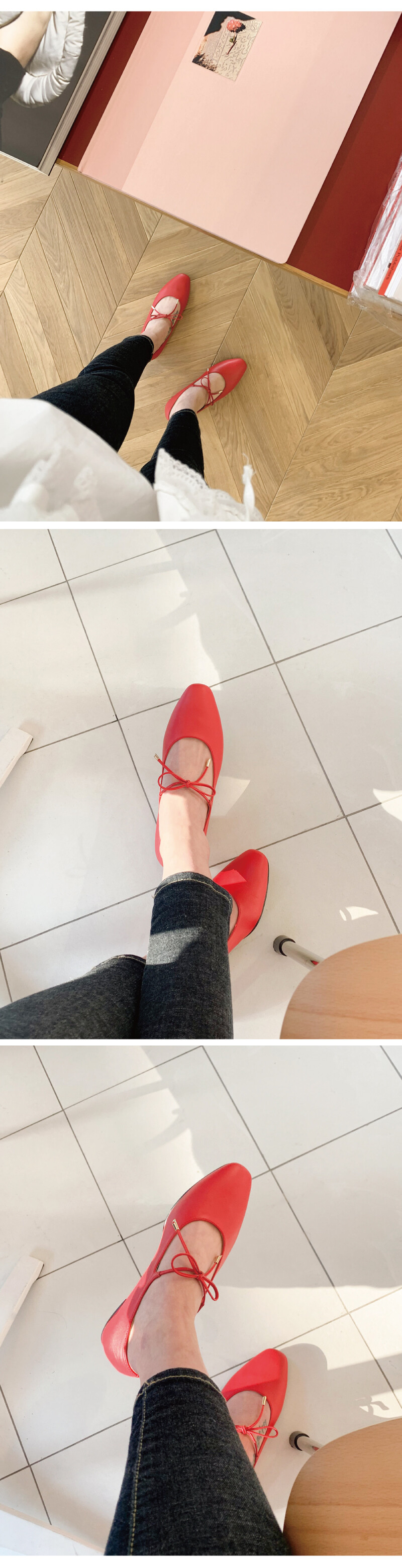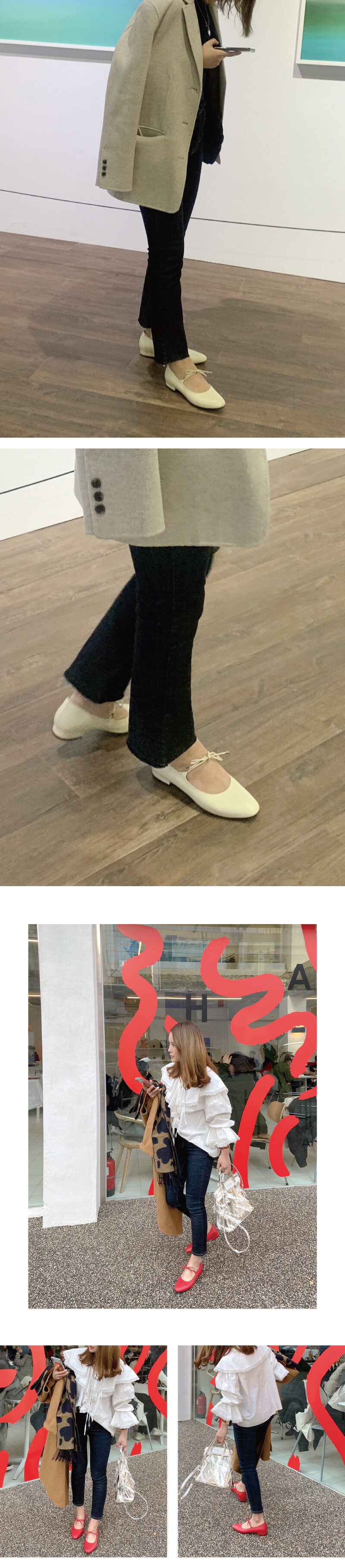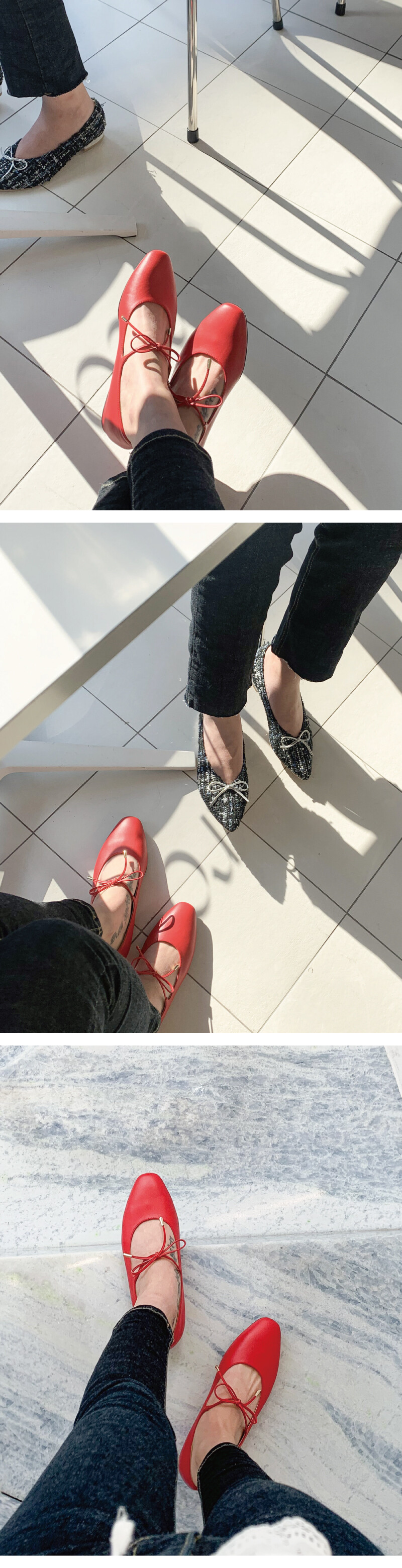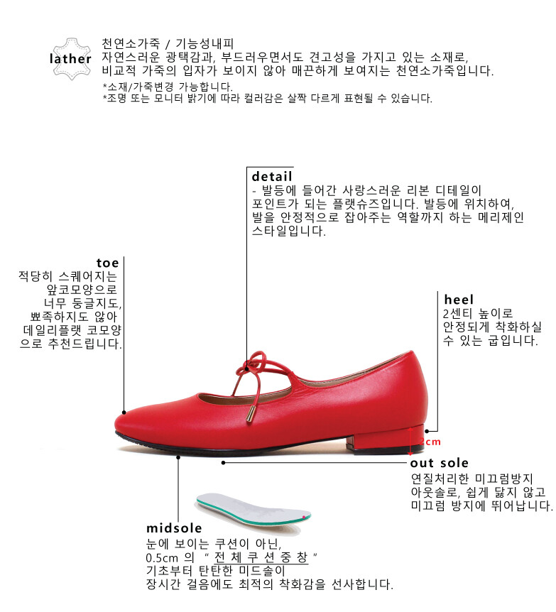 COMMENT 발등 리본이 포인트로 들어간,사랑스러운 플랫을 소개해드려요. 자연스러운 광택감과, 부드러우면서도 견고성을 가지고 있는 소재로 비교적 가죽의 입자가 보이지 않아 매끈하게 보여지는 천연소가죽입니다. 적당히 스퀘어지는 앞코모양으로 너무 둥글지도, 뾰족하지도 않아 데일리플랫 코모양으로 추천드립니다. 발등에 들어간 사랑스러운 리본 디테일이 포인트가 되는 플랫슈즈입니다. 발등에 위치하여, 발을 안정적으로 잡아주는 역할까지 하는 메리제인 스타일입니다. 넓은 굽모양의 2센티로 안정되게 착화하실 수 있는 굽입니다. 연질처리된 바닥창으로, 쉽게 닳지 않고 미끄럼방지에 뛰어납니다.