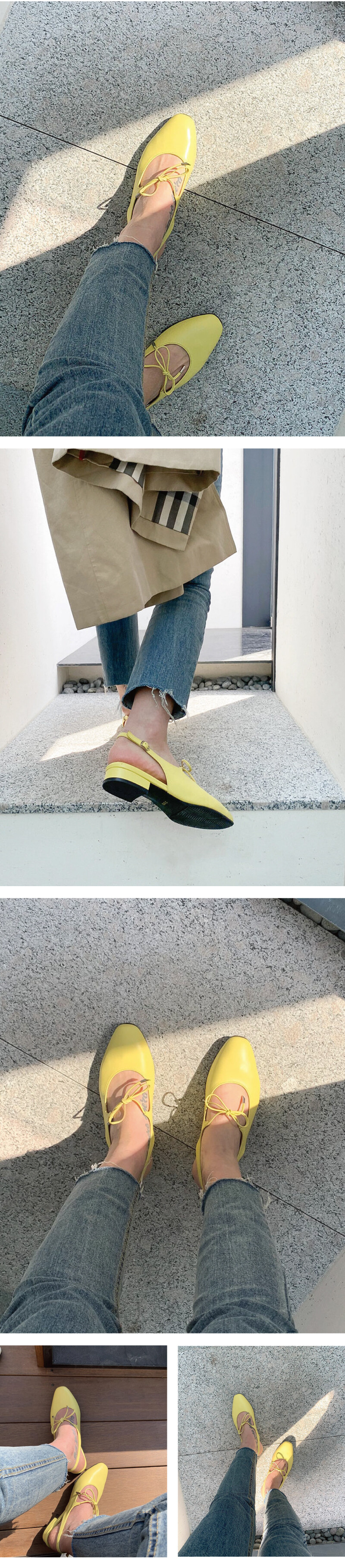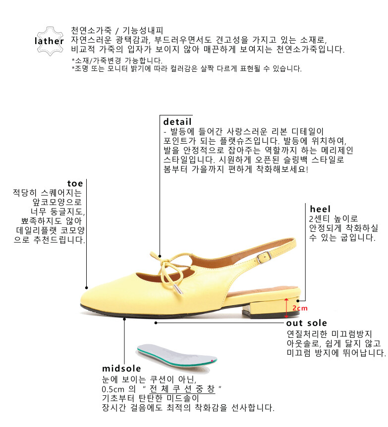 COMMENT 발등 리본이 포인트로 들어간,사랑스러운 슬링백 플랫슈즈를 소개해드려요. 자연스러운 광택감과, 부드러우면서도 견고성을 가지고 있는 소재로 비교적 가죽의 입자가 보이지 않아 매끈하게 보여지는 천연소가죽입니다. 적당히 스퀘어지는 앞코모양으로 너무 둥글지도, 뾰족하지도 않아 데일리플랫 코모양으로 추천드립니다. 발등에 들어간 사랑스러운 리본 디테일이 포인트가 되는 플랫슈즈입니다. 발등에 위치하여, 발을 안정적으로 잡아주는 역할까지 하는 메리제인 스타일입니다. 시원하게 오픈된 슬링백 스타일로 봄부터 가을까지 편하게 착화해보세요! 넓은 굽모양의 2센티로 안정되게 착화하실 수 있는 굽입니다. 연질처리된 바닥창으로, 쉽게 닳지 않고 미끄럼방지에 뛰어납니다.