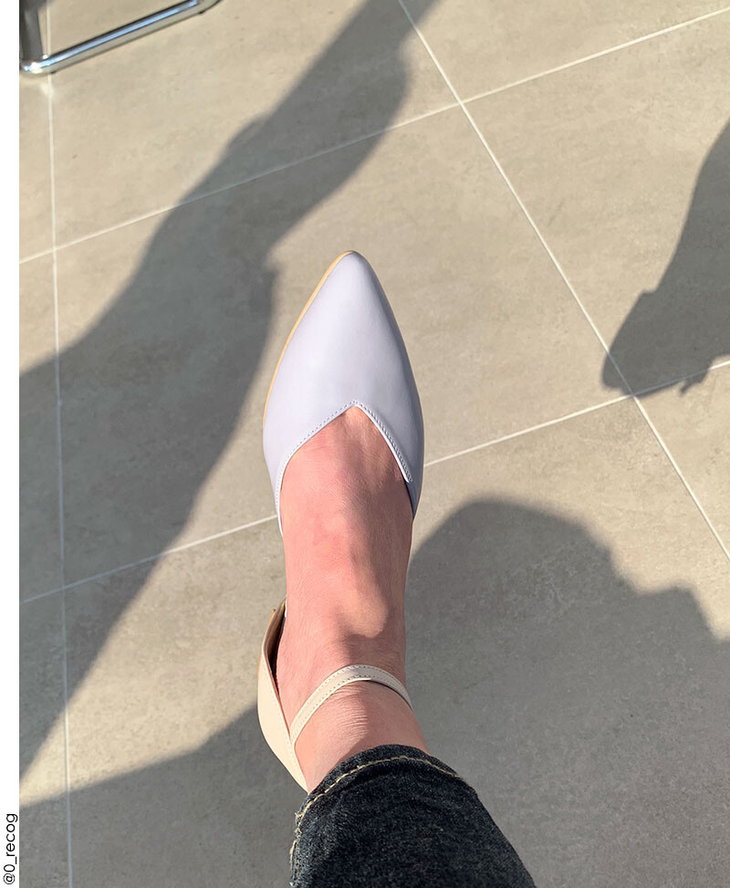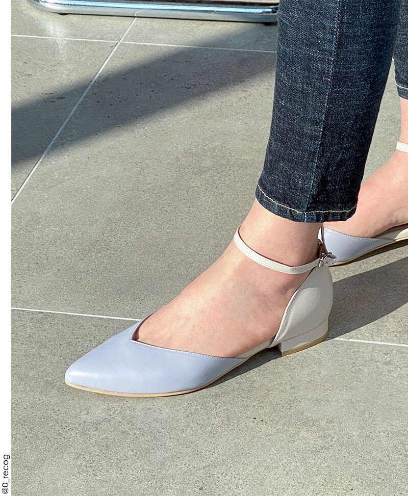 스틸레토 코와 컬러 콤비를 한 발목 스트랩 플랫