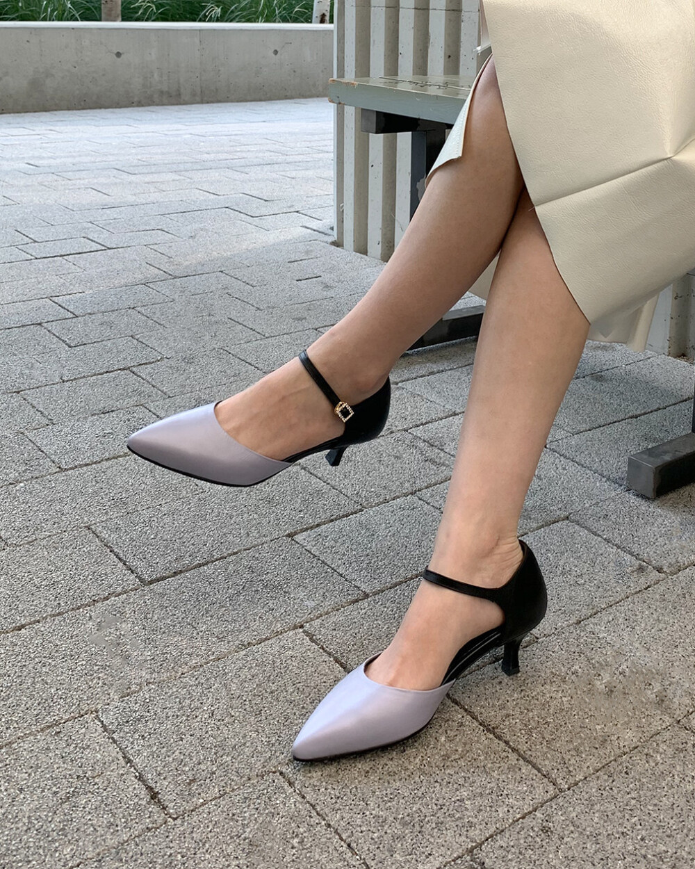 스틸레토 코에 컬러 콤비와 보석 비조로 포인트를 준 키튼 힐입니다.
