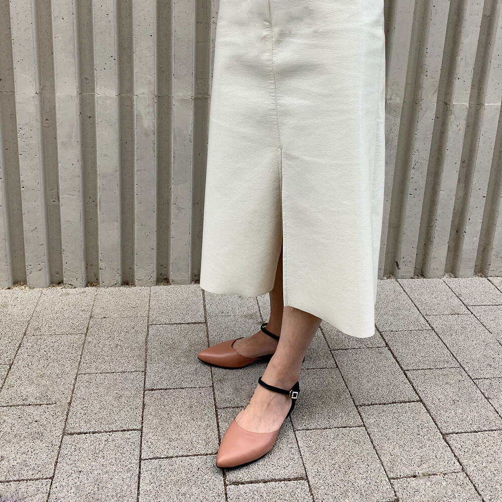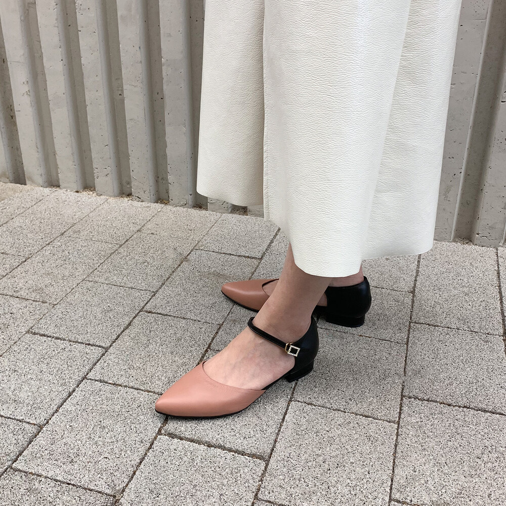 스틸레토 코에 컬러 콤비와 보석 비조로 포인트를 준 플랫입니다.