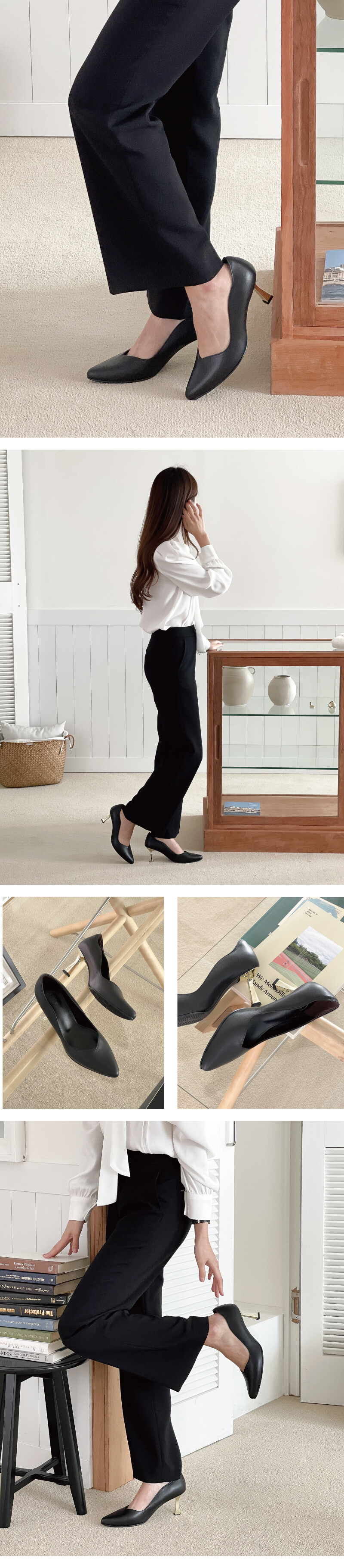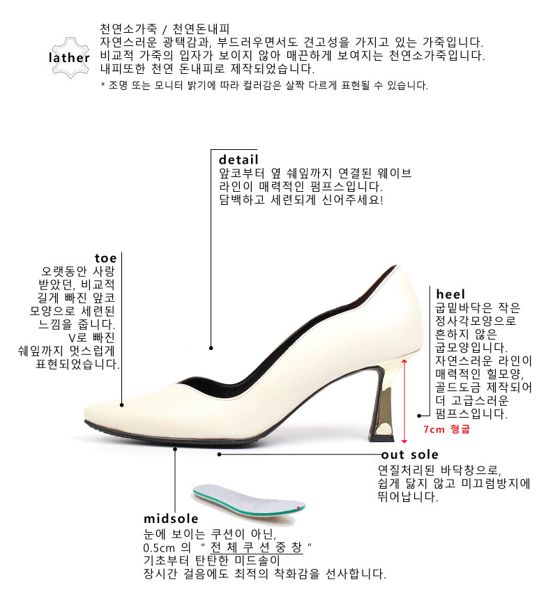 COMMENT 앞코부터 사이드까지, 자연스럽게 연결되는 웨이브 라인이 매력적인 펌프스를 소개해드립니다! 자연스러운 광택감과, 부드러우면서도 견고성을 가지고 있는 가죽입니다. 비교적 가죽의 입자가 보이지 않아 매끈하게 보여지는 천연소가죽입니다. 내피또한 천연 돈내피로 제작되었습니다. 오랫동안 사랑 받았던, 비교적 길게 빠진 앞코 모양으로 세련된 느낌을 줍니다. V로 빠진 쉐잎까지 멋스럽게 표현되었습니다. 앞코부터 옆 쉐잎까지 연결된 웨이브 라인이 매력적인 펌프스입니다. 담백하고 세련되게 신어주세요! 굽밑바닥은 작은 정사각모양으로 흔하지 않은 굽모양입니다. 자연스러운 라인이 매력적인 힐모양, 골드도금 제작되어 더 고급스러운 펌프스입니다. 연질처리된 바닥창으로, 쉽게 닳지 않고 미끄럼방지에 뛰어납니다.