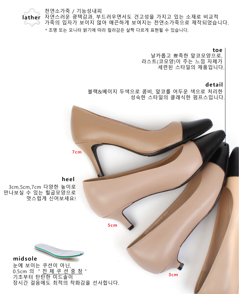 COMMENT 클래식한 디자인으로, 4계절 내내 사랑 받는 포인티드 펌프스를 소개해드려요! ◡̈ღ 자연스러운 광택감과, 부드러우면서도 견고성을 가지고 있는 소재로 비교적 가죽의 입자가 보이지 않아 매끈하게 보여지는 천연소가죽으로 제작되었습니다. 날카롭고 뾰족한 앞코모양으로, 라스트(코모양)이 주는 느낌 자체가 세련된 스타일의 제품입니다. 블랙&베이지 두색으로 콤비, 앞코를 어두운 색으로 처리한 성숙한 스타일의 클래식한 펌프스입니다. 커스텀 제작이 가능한 투톤의 펌프스로, 다양한 베이지 색감의 매끈한 소가죽과, (3cm/5cm/7cm) 높이의 선택으로 취향것 즐겨신어주세요! 힐굽모양으로 제작되어 멋스럽게 신어보실 수 있습니다! 일반창을 연질처리한 아웃솔로, 쉽게 닳지 않고 미끄럼방지에 뛰어납니다.