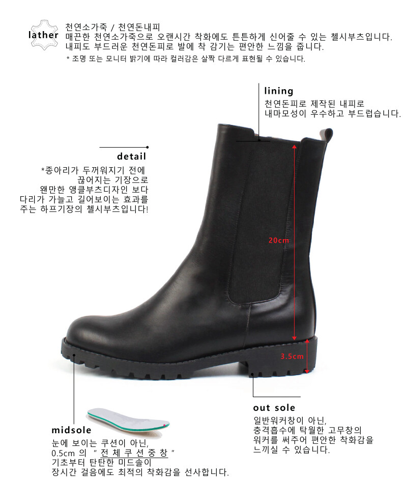 COMMENT 시크한 첼시부츠 느낌 그대로! 길게 쭉 뻣은 매니쉬한 첼시하프부츠 입니다. 수수한듯 멋스러운 느낌의 룩을 추구하시는 분들께 특히 추천해드려요. 내구성 좋은 ykk지퍼 사이드 지퍼디테일로 오픈/클로징 할 수 있어 편하답니다. 편안한 착화감을 위해 생고무창 워커창은 그대로 살려 착화감을 유지했습니다. 군더더기 없이 미니멀한 디자인으로 시크하게 신어주실 수 있는 총기장 20cm의 하프기장입니다.