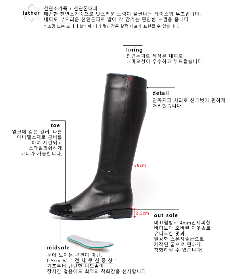 COMMENT 앞코에 같은 컬러, 다른 에나멜 소재로 콤비를 하여 세련된 느낌을 주는 롱부츠입니다. 무난한듯 세련된듯 올 겨울 스타일리쉬하게 코디하고 싶은 분들께 특히 추천해드려요. 내구성 좋은 ykk지퍼 사이드 지퍼디테일로 오픈/클로징 할 수 있어 편하답니다. 매끈한 소가죽과 돈내피로 오래오래 편안하게 신을수 있습니다. 무난한듯 하지만 앞코디테일로 시크하고 세련되게 신어주실 수 있는 총기장 38cm의 롱부츠입니다.