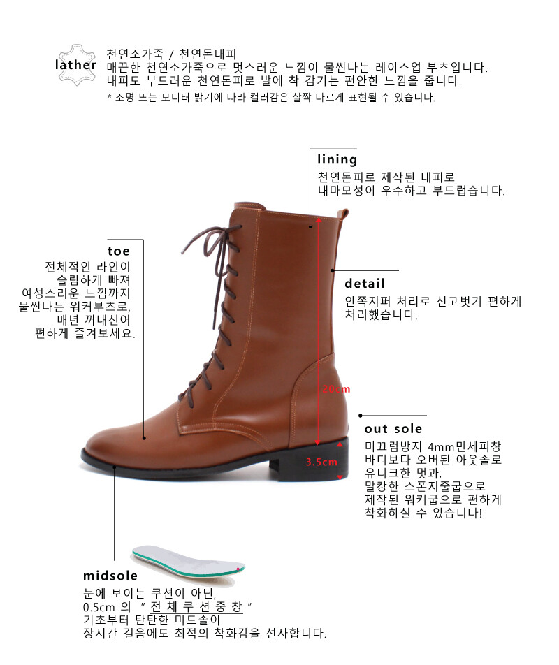 COMMENT 매끈한 소가죽과 천연돈내피로 제작되어 견고하게 오랫동안 즐겨 신을 수 있는 아이템입니다. 기존 워커스타일과 달리 투박하지 않고 슬림하게 빠진 워커부츠로 여성스러운 스타일링에도 잘 어울리며 베이직하게 신어주실수 있습니다. 매년사랑받는 기본스타일로 어디에나 즐겨신으실 수 있어요. 바닥창굽은 스폰지굽으로 소리없이, 편하게 착화가 가능합니다!