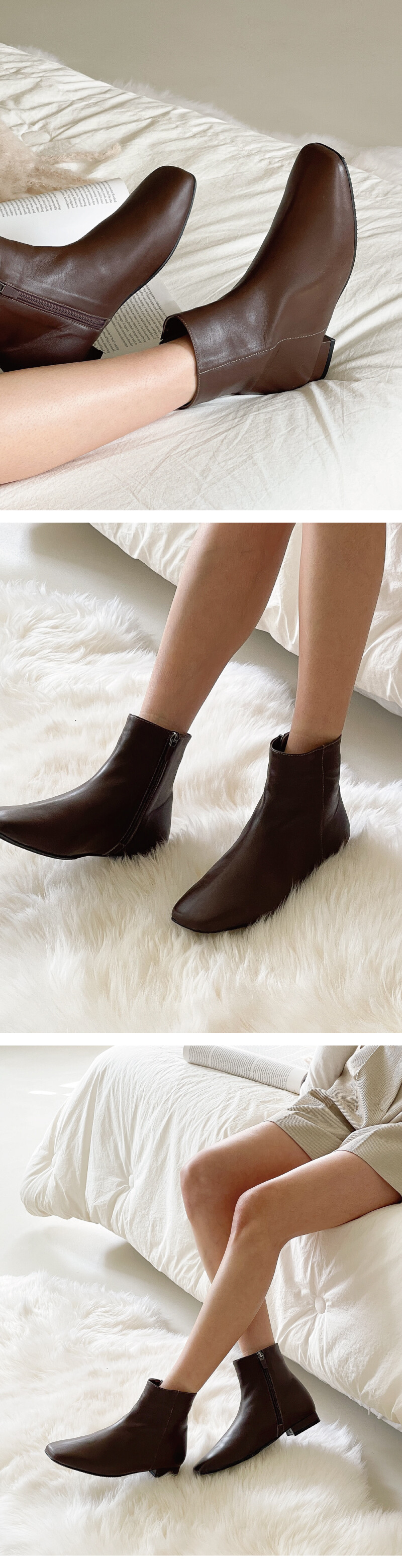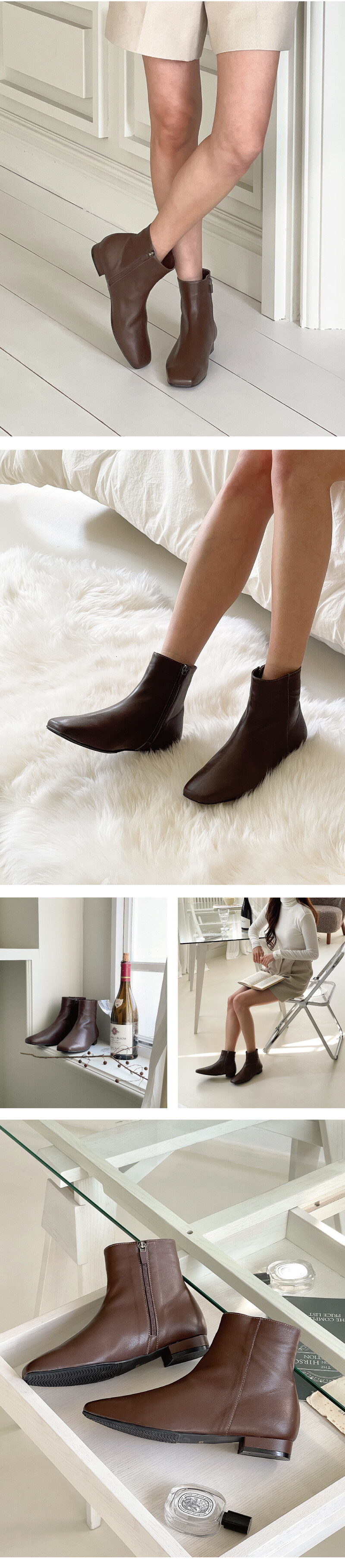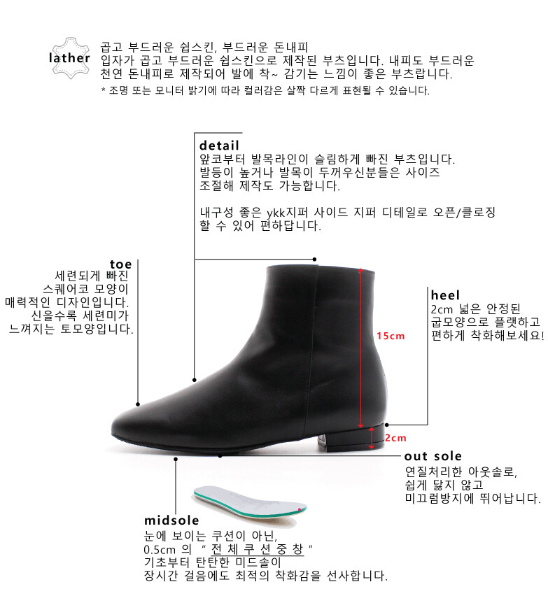 COMMENT 스퀘어토 모양의 플랫한 부츠로, 가볍고 편하게 제작된 스타일의 슈즈입니다. 핏되게 떨어지는 발목 통으로, 스타일과 실용성을 모두 만족시키는 부츠입니다. 편하고 가볍게 어느 착장에나 어울릴 수 있는 기본스타일의 플랫부츠를 소개해드립니다! 입자가 곱고 부드러운 쉽스킨으로 제작된 부츠입니다. 내피도 부드러운 천연 돈내피로 제작되어 발에 착~ 감기는 느낌이 좋은 부츠랍니다. 연질처리한 아웃솔로, 쉽게 닳지 않고 미끄럼방지에 뛰어납니다. 2cm 넓은 안정된 굽모양으로 플랫하고 편하게 착화해보세요!