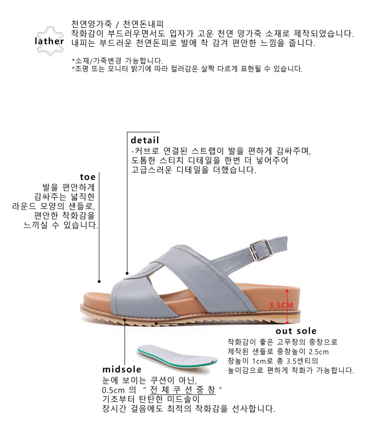 COMMENT 커브형태로 감싸주는 패턴이 시원해보이고 발을 안정적으로 잡아주는 샌들을 소개해드려요! 착화감이 부드러우면서도 입자가 고운 천연 양가죽 소재로 제작되었습니다. 내피는 부드러운 천연돈피로 발에 착 감겨 편안한 느낌을 줍니다. 발을 편안하게 감싸주는 넓직한 라운드 모양의 샌들로, 편안한 착화감을 느끼실 수 있습니다. 커브로 연결된 스트랩이 발을 편하게 감싸주며, 도톰한 스티치 디테일을 한번 더 넣어주어 고급스러운 디테일을 더했습니다. 착화감이 좋은 고무창의 중창으로 제작된 샌들로 중창높이 2.5cm 창높이 1cm로 총 3.5센티의 높이감으로 편하게 착화가 가능합니다. 말랑한 고무창의 인솔로 장시간 착화시에도 편하게 신을 수 있습니다. 빗살바닥창으로 여름철 미끄럼방지 효과를 줍니다.
