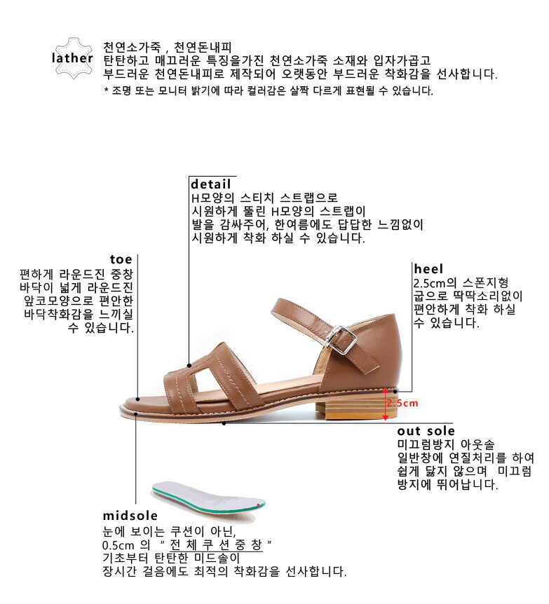 COMMENT H모양으로 스트랩이 들어간 샌들입니다. 발등을 두껍게 덮어주지 않고 트임이 있어 크게 닿는 느낌없이 편하게 신어주실 수 있습니다. 매끈하고 힘이 있는 소가죽으로 제작되어 오랜기간 착화하셔도 끄떡없는 제품입니다. 내피 또한 내구성 좋고 부드러운 천연돈내피로 제작되어 편안한 착화감을 느끼실 수 있습니다.