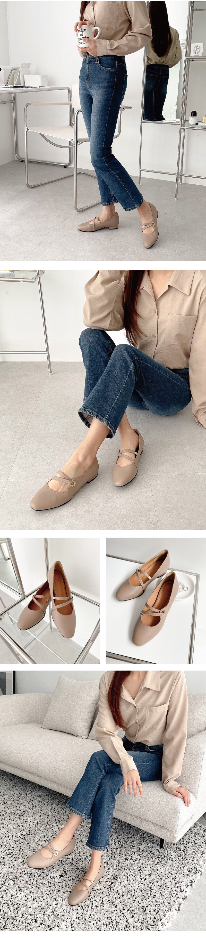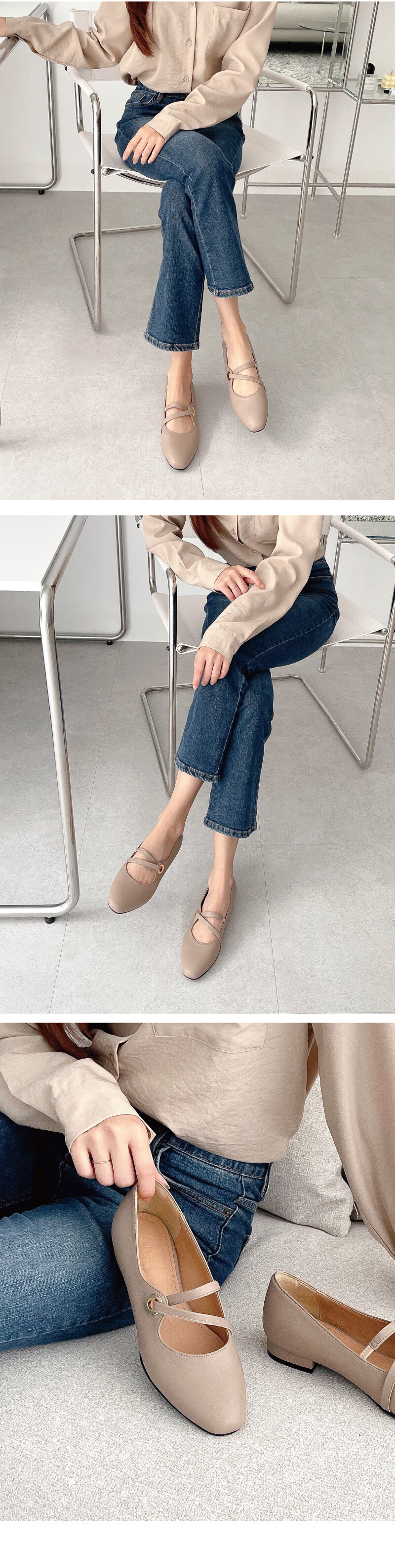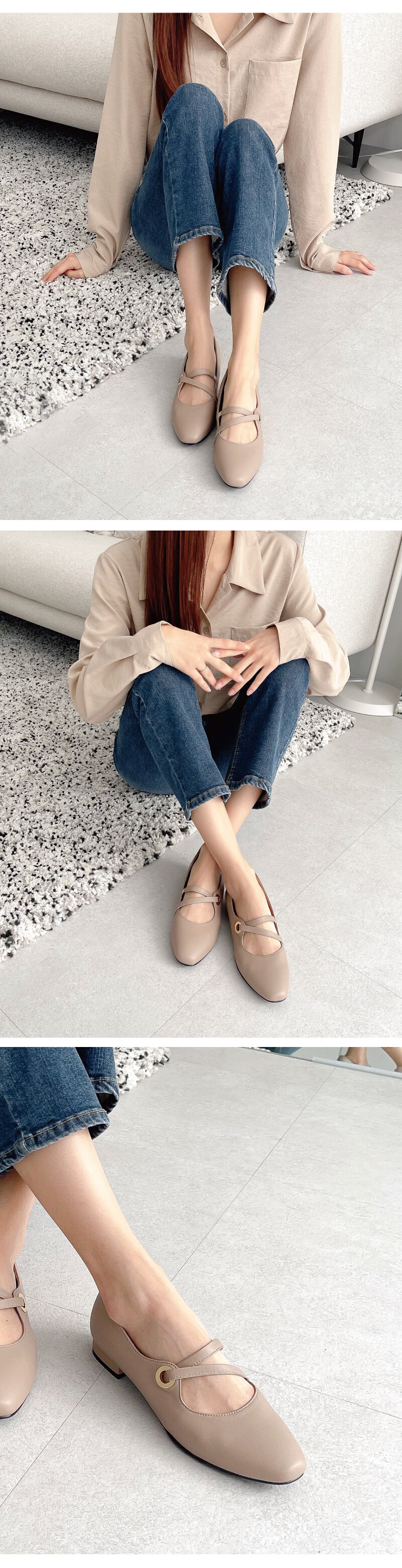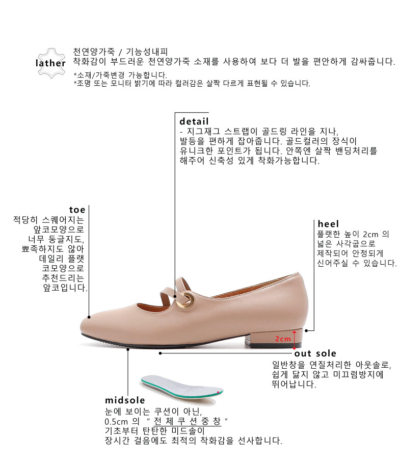 COMMENT 발등의 들어간 투 스트랩과 골드링이 멋스러운 플랫슈즈를 소개해드려요! 착화감이 부드러운 천연양가죽 소재를 사용하여 보다 더 발을 편안하게 감싸줍니다. 적당히 스퀘어지는 앞코모양으로 너무 둥글지도, 뾰족하지도 않아 데일리 플랫 코모양으로 추천드리는 앞코입니다. 지그재그 스트랩이 골드링 라인을 지나, 발등을 편하게 잡아줍니다. 골드컬러의 장식 유니크한 포인트가 됩니다. 안쪽엔 살짝 밴딩처리를 해주어 신축성 있게 착화가능합니다. 플랫한 높이 2cm 의 넓은 사각굽으로 제작되어 안정되게 신어주실 수 있습니다. 일반창을 연질처리한 아웃솔로, 쉽게 닳지 않고 미끄럼방지에 뛰어납니다.