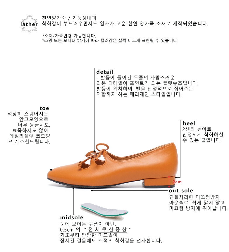COMMENT 발등 리본이 포인트로 들어간,사랑스러운 플랫을 소개해드려요. ◡̈ღ 두줄로 업그레이드된 플랫! 자연스러운 광택감과, 부드러우면서도 견고성을 가지고 있는 가죽입니다. 착화감이 부드러우면서도 입자가 고운 천연 양가죽 소재로 제작되었습니다. 적당히 스퀘어지는 앞코모양으로 너무 둥글지도, 뾰족하지도 않아 데일리플랫 코모양으로 추천드립니다. 발등에 들어간 두줄의 사랑스러운 리본 디테일이 포인트가 되는 플랫슈즈입니다. 발등에 위치하여, 발을 안정적으로 잡아주는 역할까지 하는 메리제인 스타일입니다.넓은 굽모양의 2센티로 안정되게 착화하실 수 있는 굽입니다. 연질처리된 바닥창으로, 쉽게 닳지 않고 미끄럼방지에 뛰어납니다.