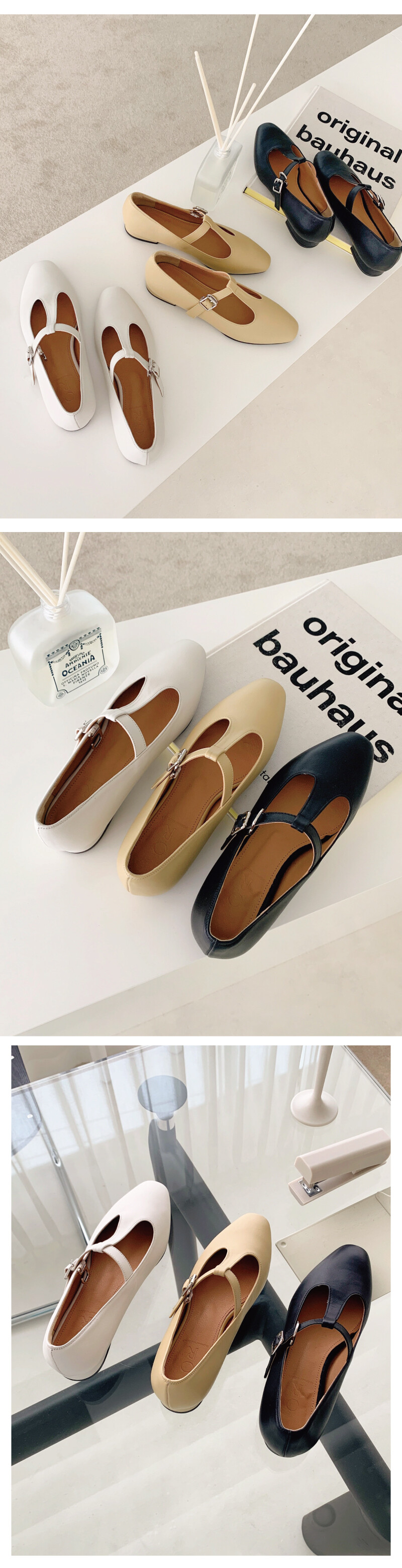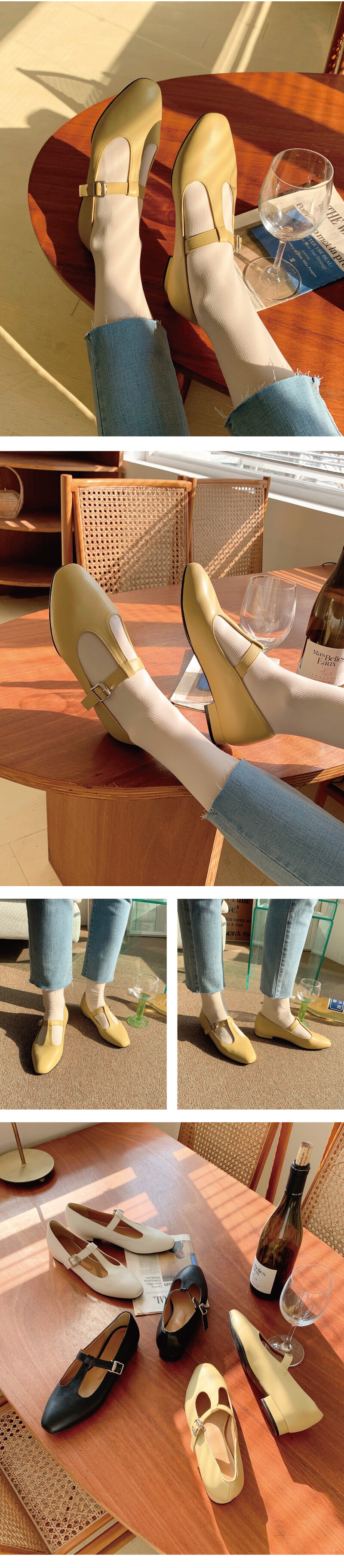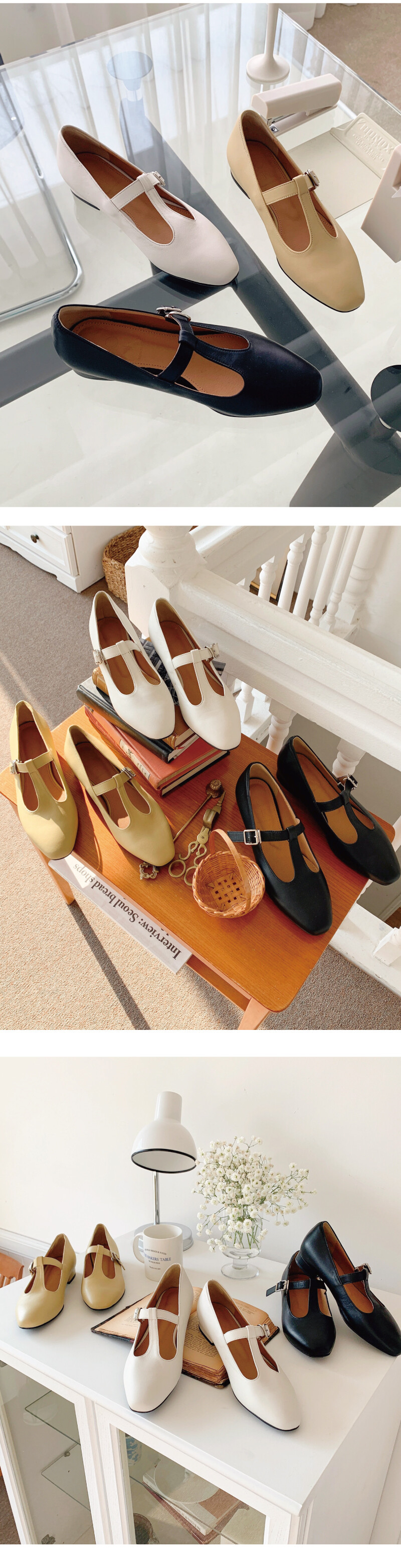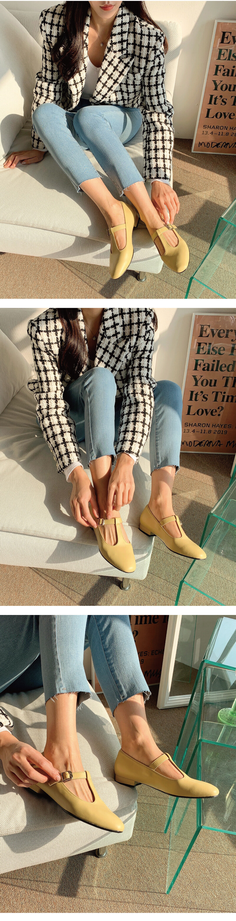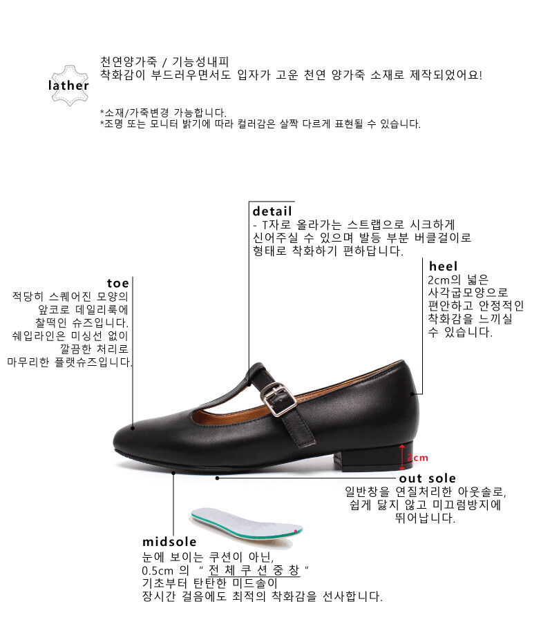COMMENT 티 스트랩으로 시크하게~ 큐크하게~ 포인트가 되는 플랫슈즈를 소개해드려요! 착화감이 부드러우면서도 입자가 고운 천연 양가죽 소재로 제작되었어요! 적당히 스퀘어진 모양의 앞코로 데일리룩에 찰떡인 슈즈입니다. 쉐입라인은 미싱선 없이 깔끔한 처리로 마무리한 플랫슈즈입니다. T자로 빠진 스트랩으로 시크하게 신어주실 수 있으며 발등 부분 버클걸이로 형태로 착화하기 편하답니다. 2cm의 넓은 사각굽모양으로 편안하고 안정적인 착화감을 느끼실 수 있습니다. 일반창을 연질처리한 아웃솔로, 쉽게 닳지 않고 미끄럼방지에 뛰어납니다.