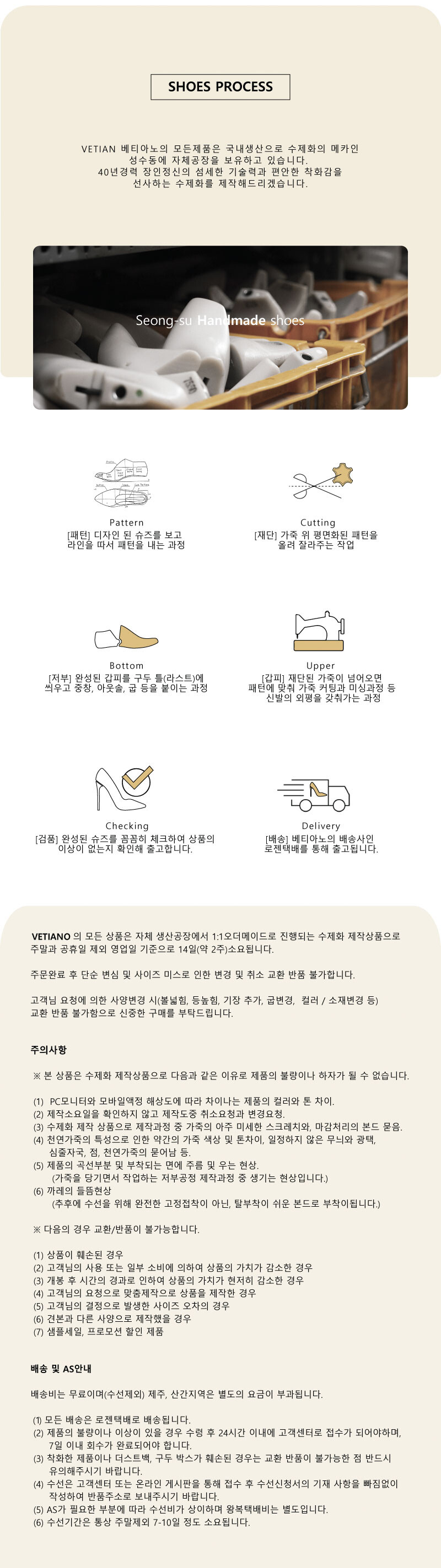 SIZE TIP 정사이즈로 주문해주세요.발볼이 넓은 고객님의 경우 꼭 "발볼넓힘"을 신청해주세요. 베티아노 모든슈즈는 1:1 order made 상품으로 구매전 담당 디자이너와의 상담을 통해 발에 맞는 사이즈를 제작해 드립니다.