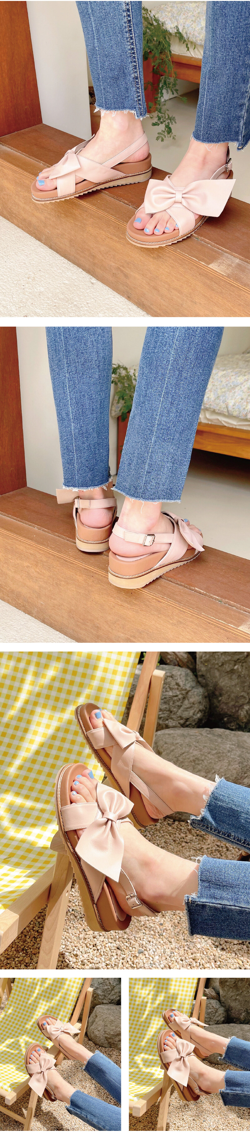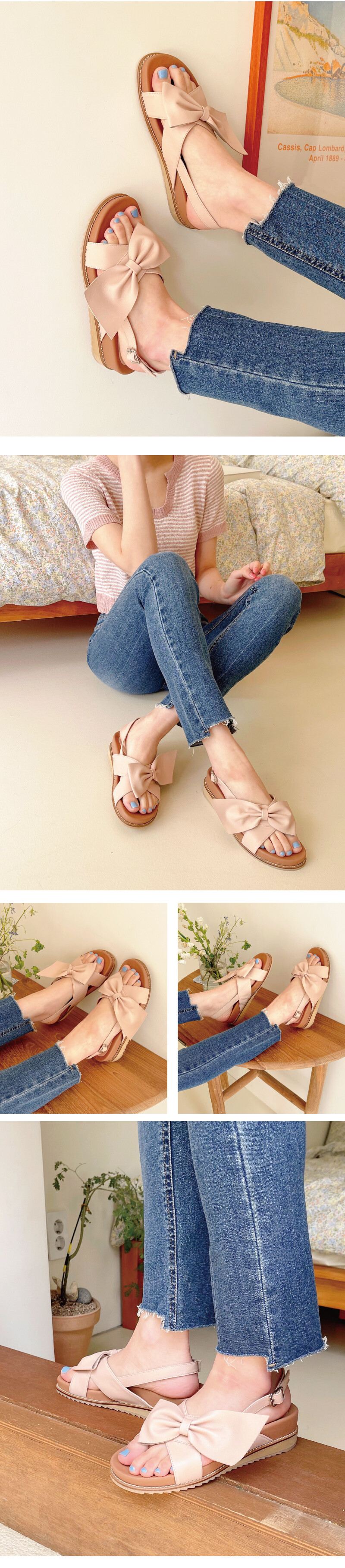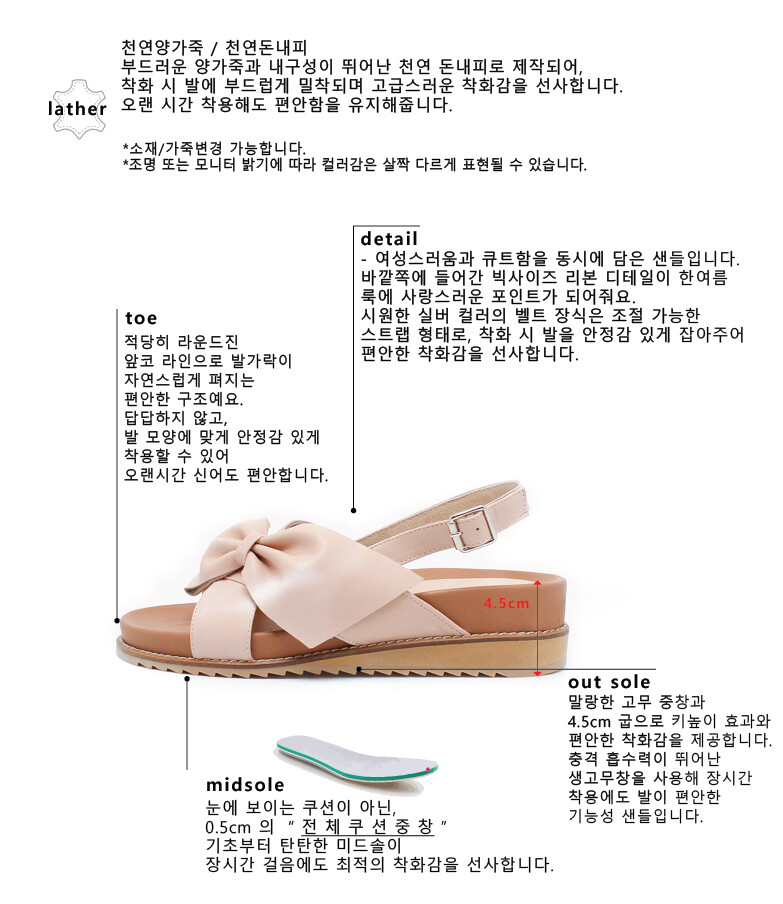 COMMENT 빅 리본으로 여성스럽고 큐트한 무드를 더한 시원한 샌들을 소개해드려요! 부드러운 양가죽과 내구성이 뛰어난 천연 돈내피로 제작되어, 착화 시 발에 부드럽게 밀착되며 고급스러운 착화감을 선사합니다. 오랜 시간 착용해도 편안함을 유지해줍니다. 적당히 라운드진 앞코 라인으로 발가락이 자연스럽게 펴지는 편안한 구조예요. 답답하지 않고, 발 모양에 맞게 안정감 있게 착용할 수 있어 오랜 시간 신어도 편안합니다. 여성스러움과 큐트함을 동시에 담은 샌들입니다. 바깥쪽에 들어간 빅사이즈 리본 디테일이 한여름 룩에 사랑스러운 포인트가 되어줘요. 시원한 실버 컬러의 벨트 장식은 조절 가능한 스트랩 형태로, 착화 시 발을 안정감 있게 잡아주어 편안한 착화감을 선사합니다.말랑한 고무 중창과 총 4.5cm의 안정적인 높이감으로 편안한 착화감을 선사하는 샌들입니다. 중창 2.5cm + 아웃솔 2cm 구성으로, 낮지 않은 적당한 굽 높이 덕분에 키높이 효과와 함께 장시간 착화에도 부담 없는 편안함을 제공합니다. 또한, 일반창이 아닌 충격 흡수력이 뛰어난 생고무창을 사용하여, 걸음걸이 시 발생하는 충격을 효과적으로 흡수해 발의 피로도를 줄여줍니다. 오랜 시간 착화해도 편안함을 유지할 수 있는 기능성 샌들로 일상 속 다양한 순간에 부담 없이 착용하실 수 있습니다.