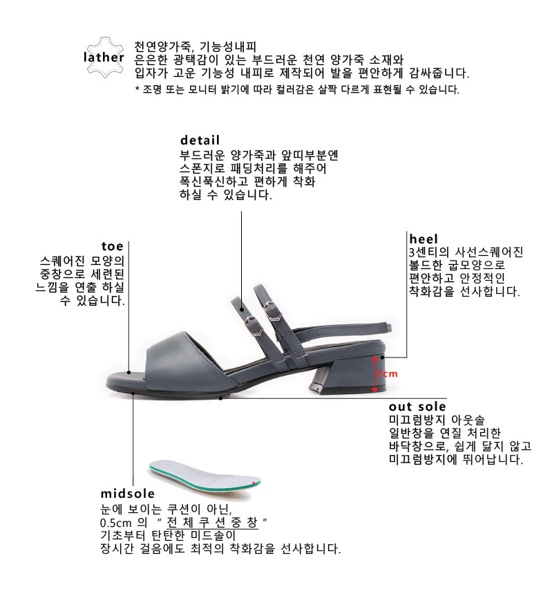 시원하면서 세련된 거기다가 플러스로 편하기 까지한 1석3조 샌들!!! 소프트한 텍스쳐의 양가죽을 사용하여 제작한 투 스트랩 디자인의 샌들 제품입니다. 띠부분에 스펀지 처리를 하여 보다 편안하게 폭신~폭신한~ 느낌으로 착화감 느낄 수 있으며 두개의 스트랩이 발등을 잡아주어 벗겨질 걱정없이 착화 하실 수있습니다. 또한 뒷꿈치부분에 밴딩처리를 해주어 신고벗기가 편한 오알의 샌들입니다. 사선 형태의 볼드한 3센티 굽으로 세련되고 안정감있고 착화해보세요~~