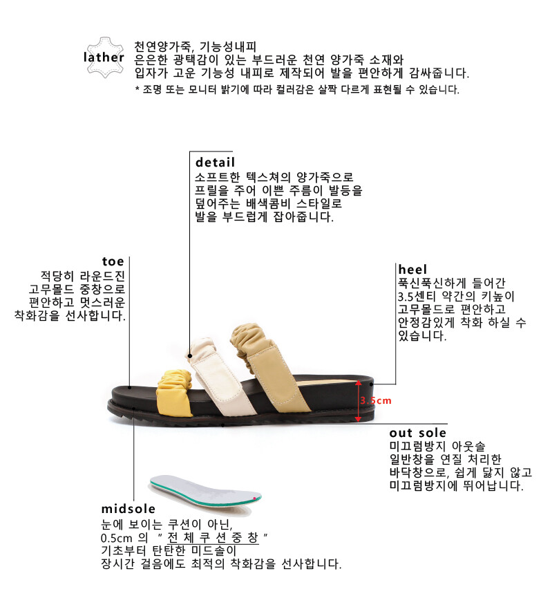 부드러운 양가죽으로 스트랩 마다 프릴을 주어 이쁜 주름으로 발등을 덮어주는 슬리퍼 샌들입니다. 2,3번째 스트랩은 벨크로가 처리로 해두어 발등이 높으시거나 발볼이 있으신 분들은 벨크로로 조절로 편히 신어주실 수 있습니다. 라임, 퍼플 컬러배색이 멋스러운 스타일의 주름스트랩이 한여름 멋스러운 슬리퍼스타일로 즐겨신어 신어주세요!