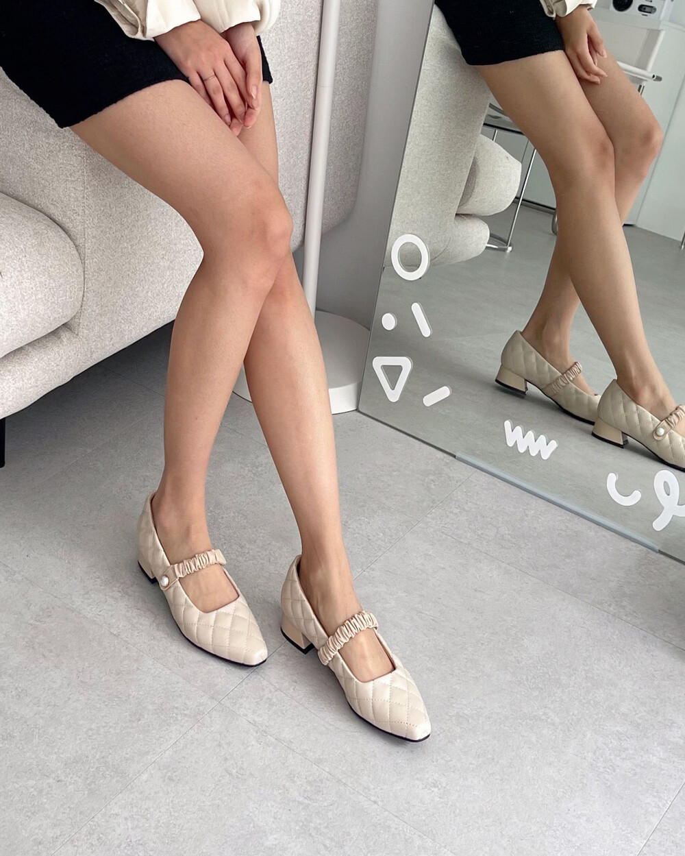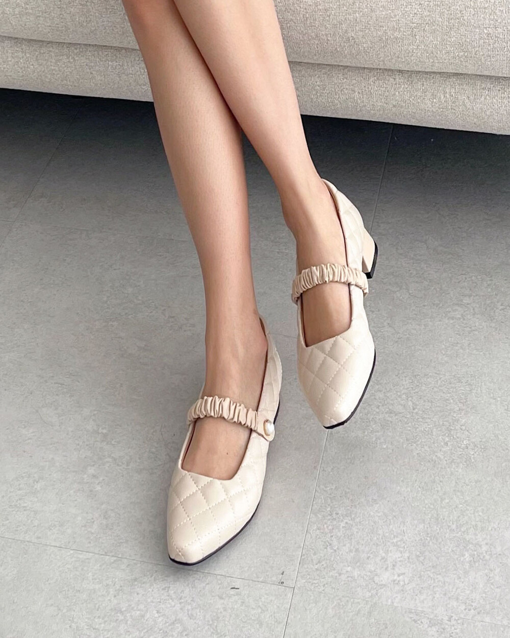 고급스럽고 부드러운 퀄팅 소재와 진주가 포인트인 플랫슈즈입니다. 폭신폭신한 느낌을 주는 퀄팅 소재는 귀여우면서도 페미닌한 느낌을 줍니다. 얄쌍하게 스퀘어진 포인티드 코가 고급스러운 느낌을 주며 부드러운 양가죽으로 셔링을 준 스트랩은 발등을 잡아주어 편안하게 신을 수 있습니다. 3센티 사선 굽으로 편안하면서도 여성스럽고 시크한 느낌까지 더해져 다양한 스타일링이 가능합니다.