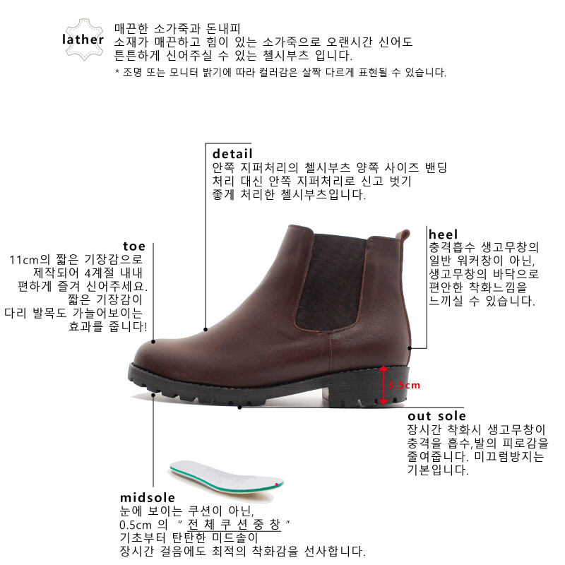 COMMENT 소재가 매끈하고 힘이 있는 소가죽으로 오랜시간 신어도 튼튼하게 신어주실 수 있는 첼시부츠 입니다. 11cm의 짧은 기장감으로 제작되어 4계절 내내 편하게 즐겨 신어주세요. 짧은 기장감이 다리 발목도 가늘어보이는 효과를 줍니다! 양쪽 사이즈 밴딩 처리 대신 안쪽 지퍼처리로 신고 벗기 좋게 처리한 첼시부츠입니다. 충격흡수 생고무창의 일반 워커창이 아닌, 생고무창의 바닥으로 편안한 착화느낌을 느끼실 수 있습니다.