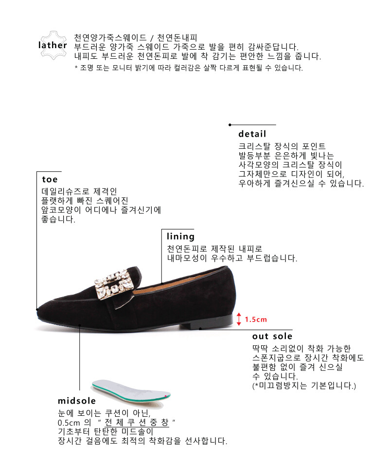 COMMENT 발등부분 은은하게 빛나는 사각모양의 크리스탈 장식이 그자체만으로 디자인이 되어, 우아하게 즐겨신으실 수 있습니다. 바디는 부드러운 양가죽 스웨이드로 제작되었고, 전체적으로 둘러진 수입모자테로 디테일을 더해주었습니다. 스퀘어진 앞코모양은 언제 어디서나 즐겨신을 수 있는 모양으로 데일리슈즈로 즐겨 신을 수 있습니다. 딱딱 소리없이 착화가 가능한 스폰지굽으로 장시간 착화에도 불편함 없이 즐겨 신으실 수 있습니다. (* 미끄럼방지는 기본입니다.)