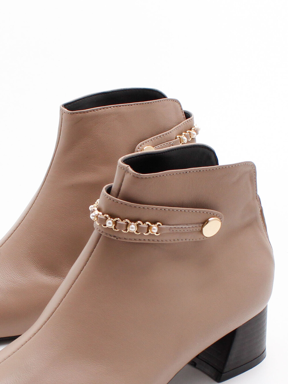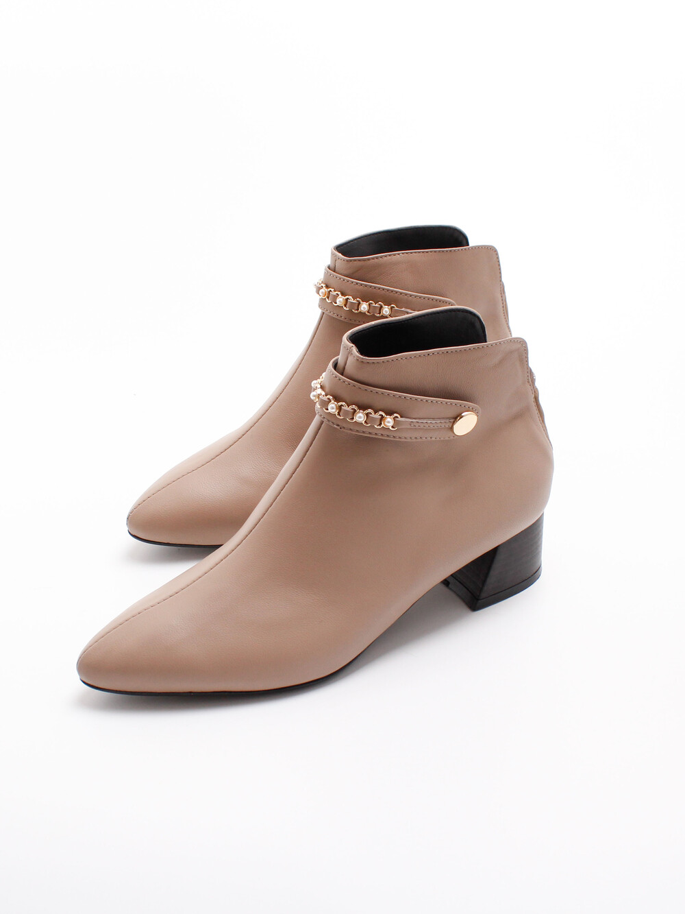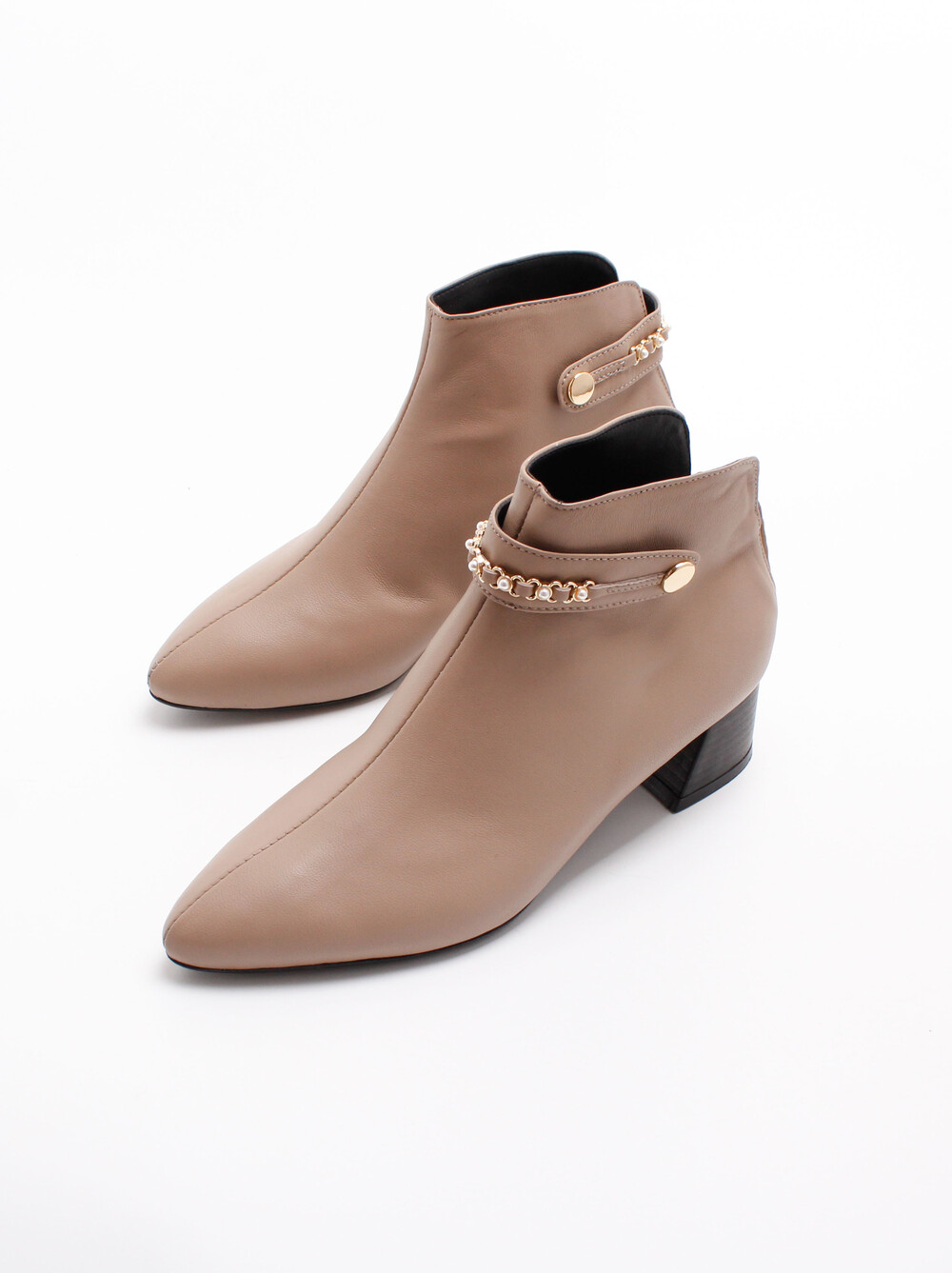 탈부착이 가능한 진주 체인의 장식과 뒷부분의 스판이 돋보이는 앵클부츠입니다. 앞뒤 자유자재로 스타일링이 가능한 진주 체인과 뾰족한 포인티드 앞 코로 세련되면서도 고급스러운 느낌을 줍니다. 발뒤축은 잠수복 스판을 사용하여 딱딱함 없이 편안하게 제작되었으며 양가죽 소재로 발을 편안하게 감싸줍니다. 사선으로 떨어지는 4센티 미들힐로 세련됨을 더했습니다.
