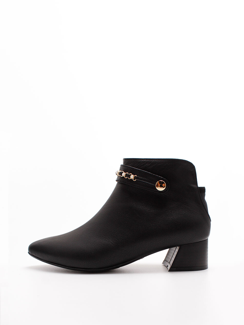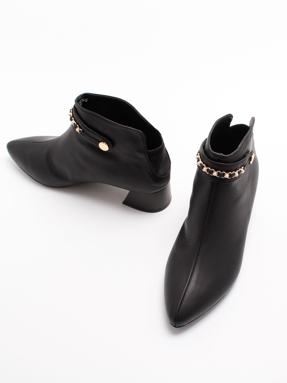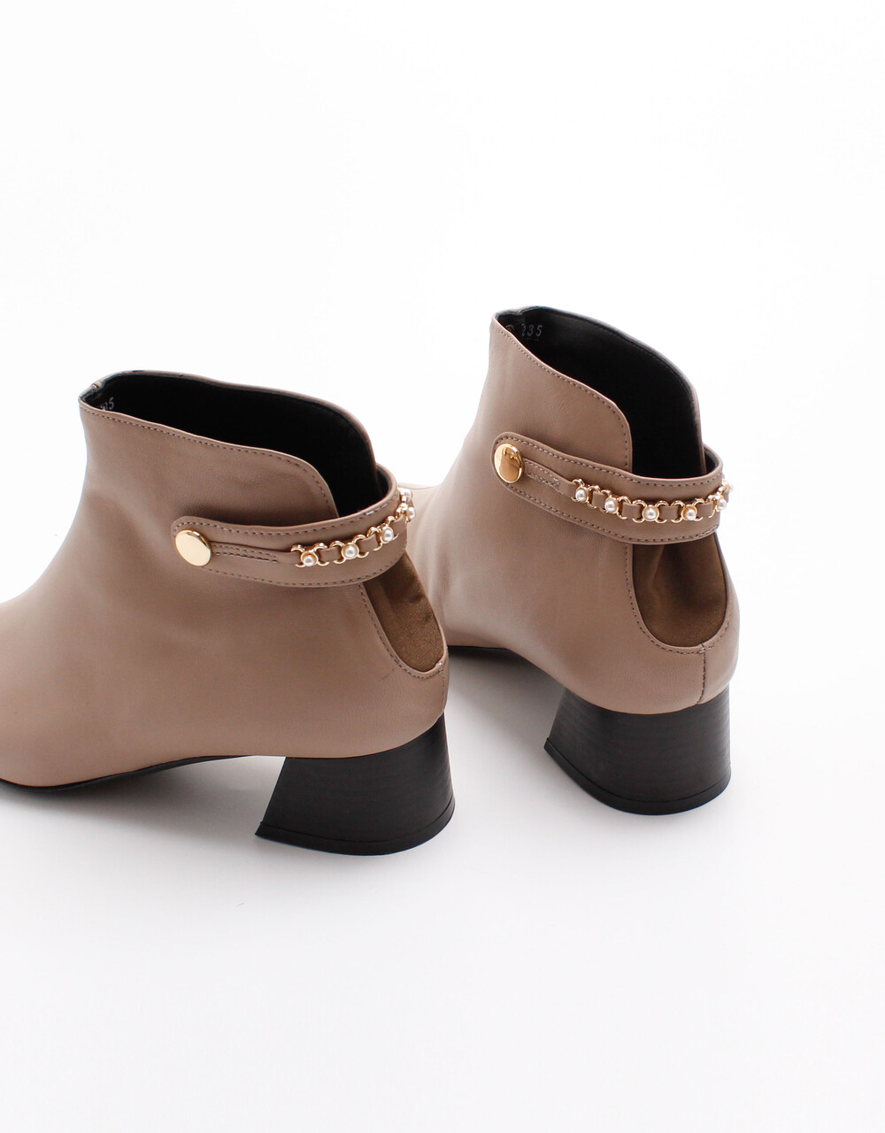 탈부착이 가능한 진주 체인의 장식과 뒷부분의 스판이 돋보이는 앵클부츠입니다. 앞뒤 자유자재로 스타일링이 가능한 진주 체인과 뾰족한 포인티드 앞 코로 세련되면서도 고급스러운 느낌을 줍니다. 발뒤축은 잠수복 스판을 사용하여 딱딱함 없이 편안하게 제작되었으며 양가죽 소재로 발을 편안하게 감싸줍니다. 사선으로 떨어지는 4센티 미들힐로 세련됨을 더했습니다.