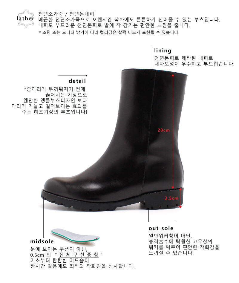 시크한 첼시부츠 느낌 그대로! 길게 쭉 뻣은 매니쉬한 하프부츠 입니다. 수수한듯 멋스러운 느낌의 룩을 추구하시는 분들께 특히 추천해드려요. 편안한 착화감을 위해 생고무창 워커창은 그대로 살려 착화감을 유지했습니다. 군더더기 없이 미니멀한 디자인으로 시크하게 신어주실 수 있는 총기장 20cm의 하프기장입니다.