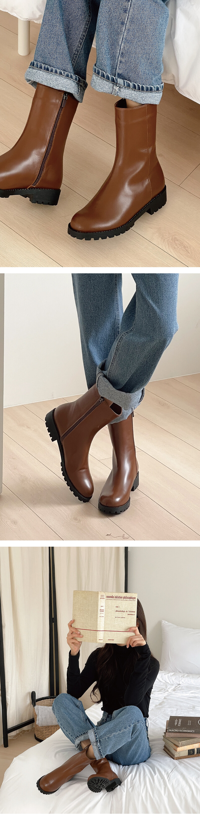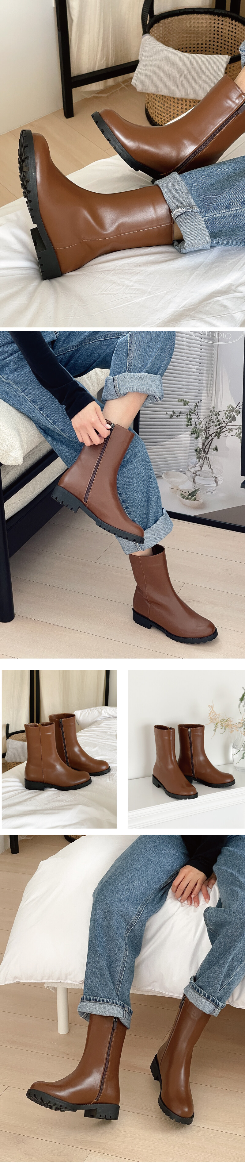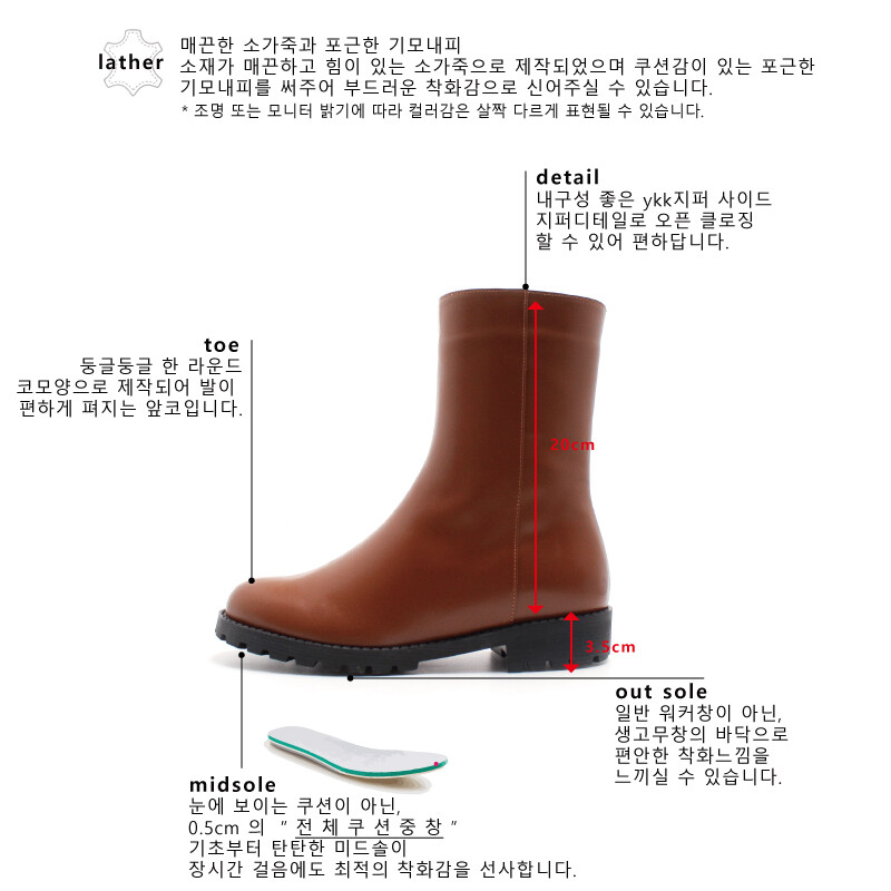 COMMENT 정사이즈로 추천해드립니다.! 겨울부츠라고 한사이업 하실 필요 전-혀 없으세요, 고무창이라 넉넉한 느낌있으세요. 바닥 창이 생고무창으로 제작되어 있어 "딱딱" 소리없이 즐겨 신을 수 있는 디자인에 이랍니다. 여행중 장시간 착화시에도 너무 편하게 신고 착화한제품이랍니다. 부츠 기장(20cm) 종아리 두꺼워지기 전 딱 끊어 주어, 다른 앵클부츠보다 훨씬 다리가 가늘어보이고 길어보이는 효과까지 나는!! 세련된 부츠랍니다. 종아리 알 시작되기 전에 딱 끊어 주는 센스! 완전 강추 해드릴게요 *-*