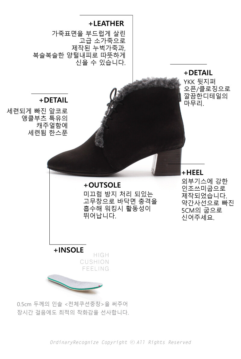 베이직한 느낌과 트렌디한 느낌을 동시에 주는 스타일의 앵클부츠입니다. 세련되게 빠진 스퀘어 앞 코로 앵클부츠 특유의 캐주얼함에 세련됨을 더했습니다. 군더더기 없이 깔끔한 패턴과 ykk지퍼는 뒤로 빠져 오픈/클로징으로 깔끔한디테일의 마무리되었습니다. 21fw시즌 복슬 복슬 귀여운 양털내피로 한겨울 어떻게 연출하느냐에 따라 아주 귀여워 보일 수도 있고 담백해 보일 수 있는 신발이라 생각합니다. 따뜻함까지 level up된 데저트부츠를 만나보세요!