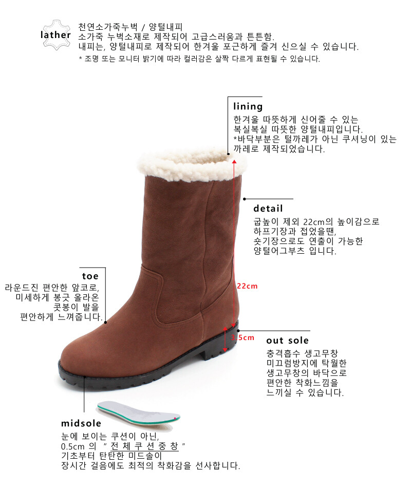 튼튼하고 부드러운 소가죽 누벅 소재로 제작되어 고급스러운 느낌으로 편하게 즐길수 있는 양털어그부츠입니다. 여유있는 통으로 발이 쑥~ 들어가는 통부츠 스타일의 양털부츠로 앞코부분이 미세하게 올라와 편안한 느낌을 주실 수 있습니다. 굽제외 22cm의 기장감으로 하프기장과, 숏기장으로도 연출이 가능한 부츠입니다. 한겨울 포근하고 스타일리시한 겨울 무드를 연출해보세요! 아웃솔 역시 일반 워커창이 아닌, 생고무창의 워커창으로 제작되어 장시간 착화시에도 편안한 착화감을 느끼실 수 있습니다.
