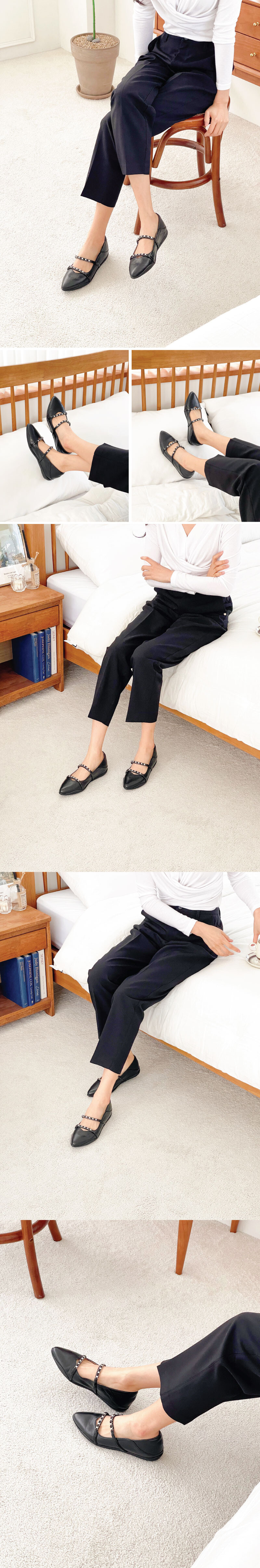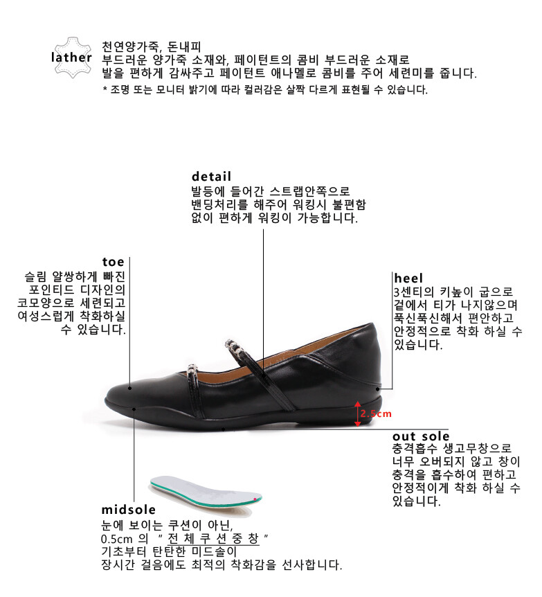 COMMENT 살짝 포인티드된 앞코모양이 멋스러운 생고무창의 플랫슈즈입니다! 좀처럼 보기 힘든 포인티드 코모양의 고무창인데요! 아웃솔이 너무 편안한 착화감을 주어, 장시간 착화시에도 부담없이 즐기실 수 있습니다. 뒷꿈치 부분 외피와 내피 사이에 들어가는 보형물(월형)이 탄력있는 스폰지로 들어가 있어, 부드러운 착화감을 느끼실 수 있습니다. 발등 투 스트랩이 발을 잡아주어 벗겨지는 느낌 또한 잡은 스타일의 플랫슈즈입니다! 아웃솔 컬러는 블랙/베이지 두가지중 선택가능합니다.