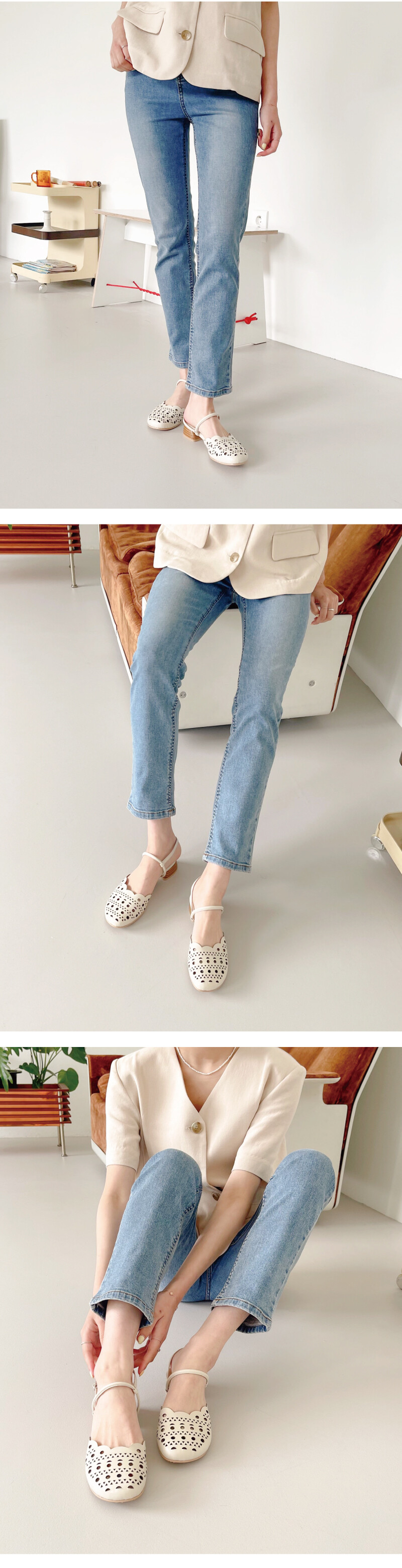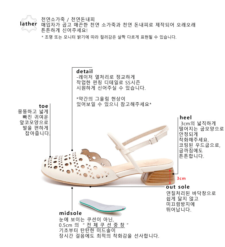COMMENT 물결진 앞라인과 정교한 레이저 펀칭으로 시원하게 신어주실 수 있는 샌들 플랫을 소개해드려요. 뒷꿈치 부분은 샌들형태로 되어 있어, 슥~ 신기 편하답니다! 입자가 곱고 매끈한 천연 소가죽과 천연 돈내피로 제작되어 오래오래 튼튼하게 신어주세요! 뭉뚱하고 넓게 빠진 귀여운 앞코모양으로 발을 편하게 잡아줍니다. 레이저 열처리로 정교하게 작업한 펀칭 디테일로 SS시즌 시원하게 신어주실 수 있습니다. *약간의 그을림 현상이 있어보일 수 있으니 참고해주세요* 3cm의 넓직하게 떨어지는 굽모양으로 안정되게 착화해주세요. 코팅된 우드굽으로, 굽까짐에도 튼튼합니다. 연질처리된 바닥창으로 쉽게 닳지 않고 미끄럼방지에 뛰어납니다.