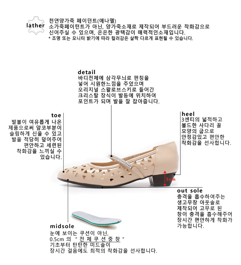COMMENT 부드러운 양가죽페이턴트로 제작되어 편안한 착화감을 느끼실수 있는 플랫슈즈입니다. 바디전체로 삼각무늬로 펀칭을 넣어줘 시원한 느낌을 주었으며, 전체적으로 펀칭이 들어가게 되면서 한층 더 부드러운 느낌으로 신어주실수 있습니다. 오리지널 스왈로브스키로 들어간 크리스탈 장식이 발등에 위치하여 포인트가 되며, 발을 잘 잡아주는 역활까지 하는 플랫슈즈입니다. 아웃솔 충격흡수에 탁월한 생고무창을 써주어 장시간 착화시에도 충격을 흡수하여 발에 피로감을 줄여줍니다. (미끄럼방지는 기본입니다.)