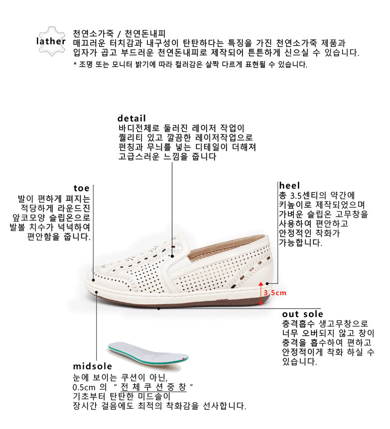 COMMENT 매끈하고 힘있는 천연 소가죽으로 제작되어 튼튼하게 오래신으실 수 있는 슬립온입니다. 양쪽 밴딩처리로 끈이 없이 제작되어 편하게 신고벗을 수 있으며, 바디 전체로 들어간 레이저컷팅 무늬와 디테일이 고급스러움을 더한 제품입니다. 3.5센티의 생고무창 바닥으로 장시간착화시에도 큰 무리없이 신어주세요!