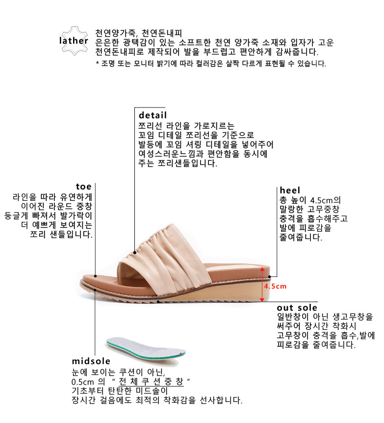 COMMENT 쪼리선을 가로지르는 꼬임 디테일 쪼리선을 기준으로 발등에 꼬임 셔링 디테일을 넣어주어 여성스러운 느낌과 편안함을 동시에 주는 쪼리샌들입니다. 부드러운 양가죽과 돈내피로 제작되어 편안한 착화감을 느끼실 수 있습니다. 4.5센티의 낮지 않은 굽높이와 고무창의 중창, 충격을 흡수해주는 아웃솔까지! 피로감이 덜한 여름철 샌들로 강추해드리는 제품입니다.